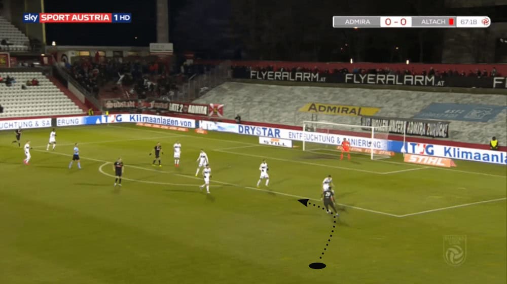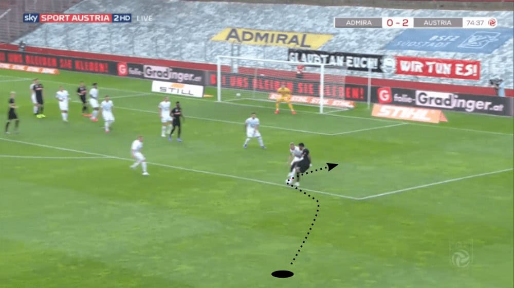 However, he has an xA-value per 90 minutes of 0.17 which is more than the average for the wingers in the Austrian Bundesliga with at least 500 minutes in the 2019/20 season (0.16). We can see an example in the shot below as he once more cuts to the inside from the right flank to then play a decent through pass.