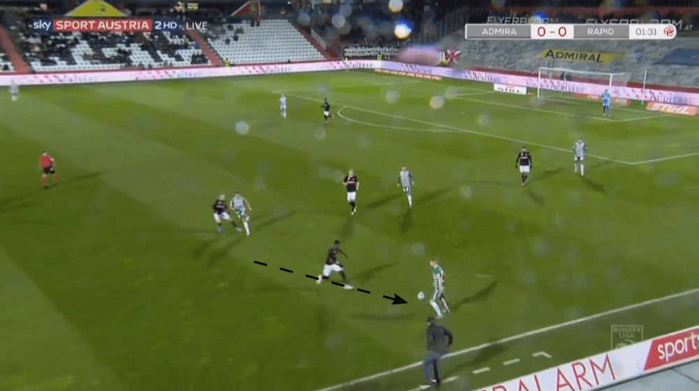 Whenever they do so, Saracevic is a vital player due to his speed and aggression. He is involved in 5.91 defensive duels per 90 on average, wins 56% of them and has overall made 6.5 successful defensive actions per 90 minutes. All three of those values are slightly above-average for a winger in the Austrian Bundesliga, showing that he is ready to work for his team and during the high pressing he is very active as we can see below where he sprints towards Maximilian Ullmann to put pressure on him.
