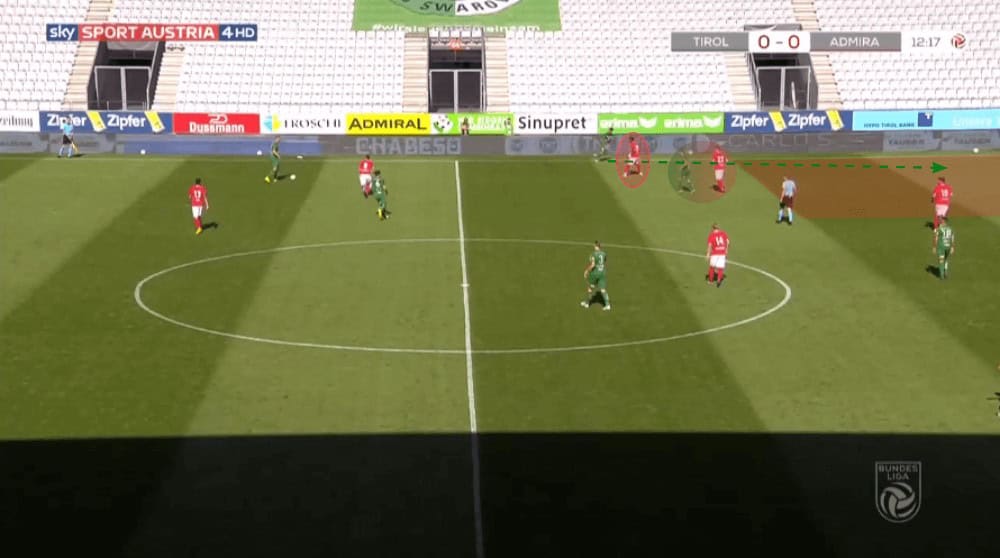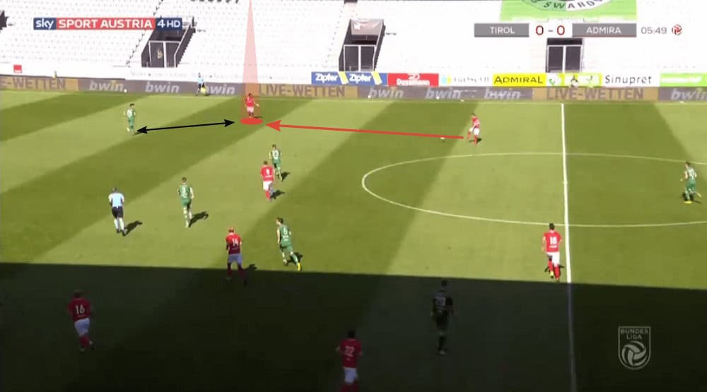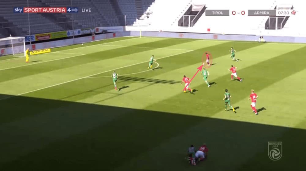 While Saracevic works hard for his team defensively, we can see in several situations that he is still young and not a defender, meaning that he does not consequently follow his opponents. When there is a lack of necessary communication between him and the full-back, this can lead to some bad situations like the one below as Saracevic doesn’t follow Tirol’s full-back while Admira’s right-back marks his direct opponent meaning that nobody tracks the deep run of Tirol’s wide player who then receives a decent lobbed through pass into the marked area.