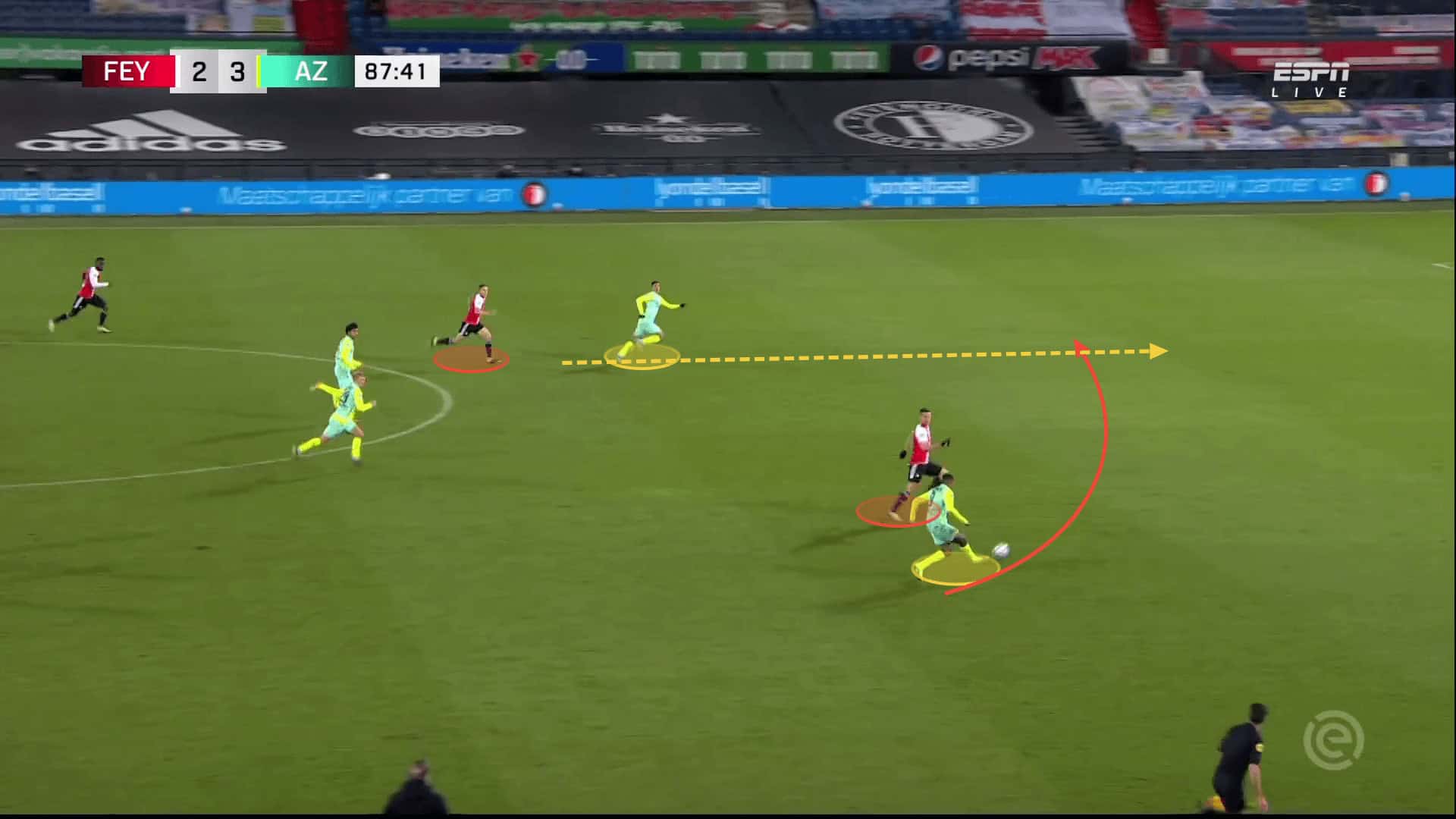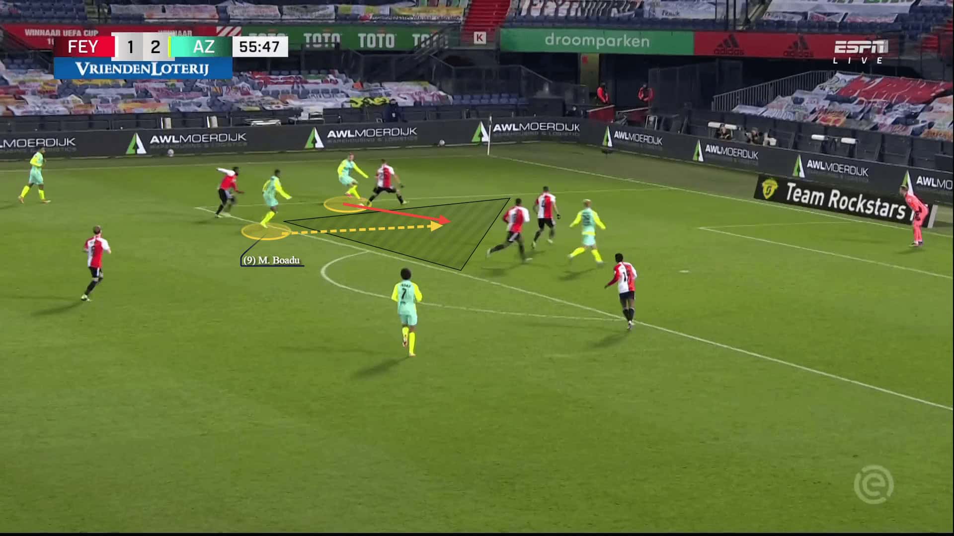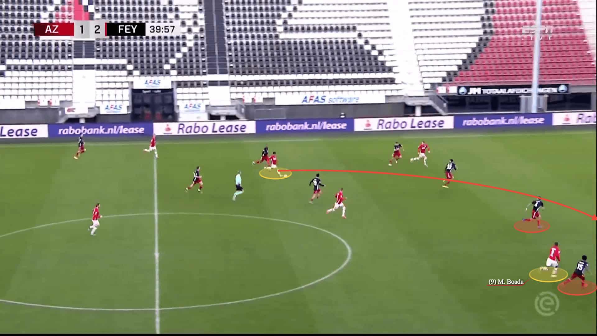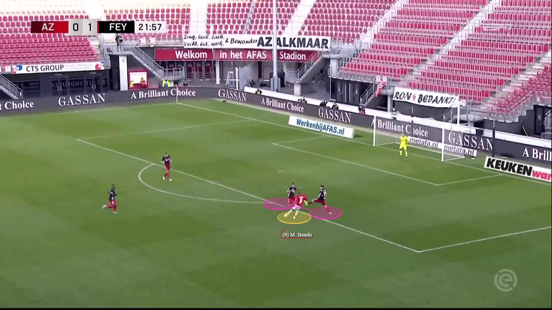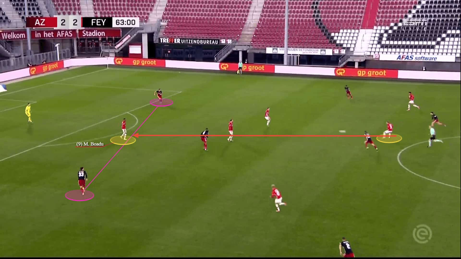 Apart from his intelligent movement, what makes Boadu such an efficient striker is his flair and confidence on the ball. He is capable of escaping his markers in a split-second and in scoring goals with one touch. This does increase AZ’s explosiveness in front of the goal and allows them to quickly transfer their attacks into goals.