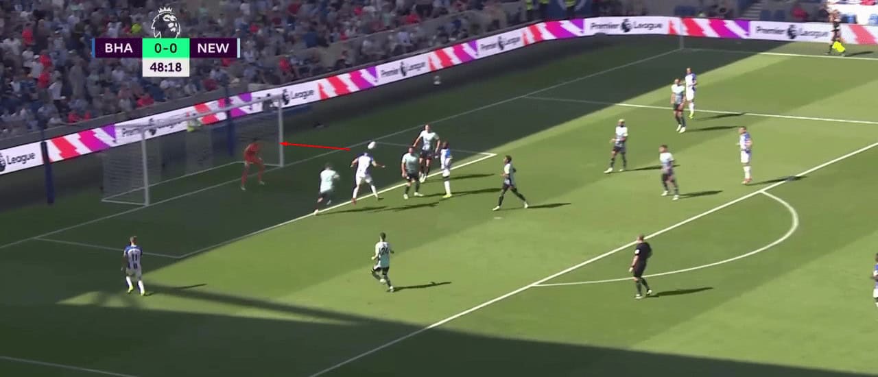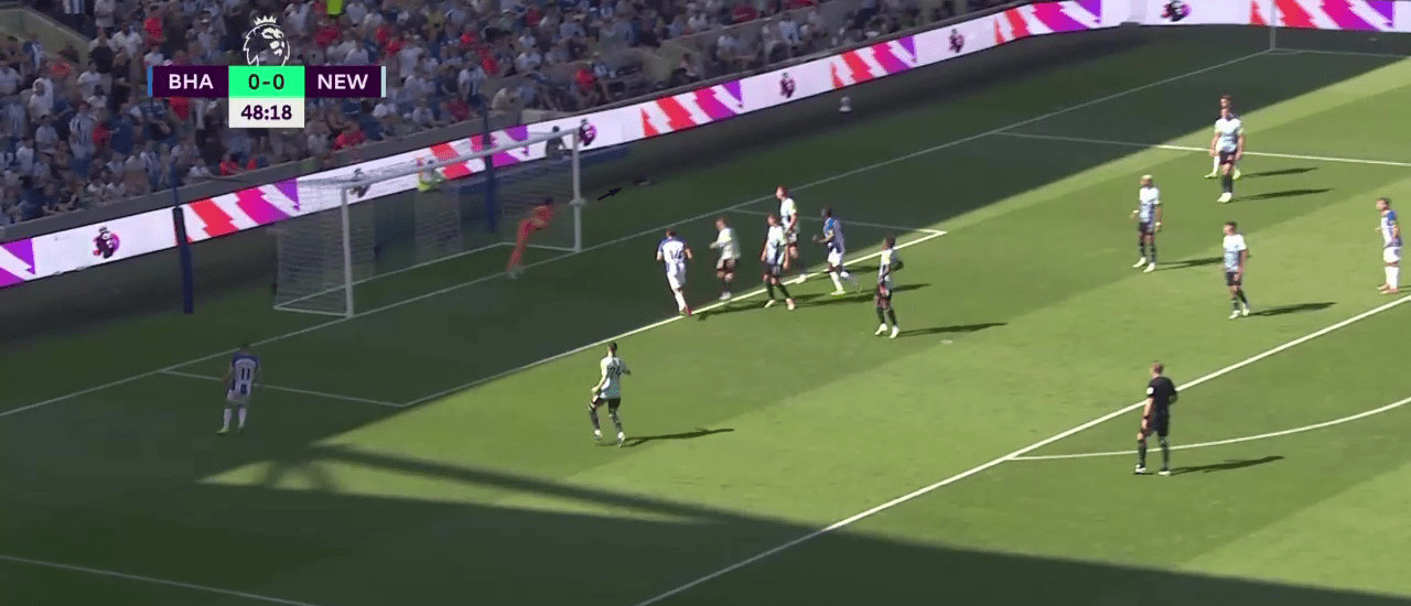 The Brighton man has an unmarked header just outside of the six-yard box, giving the goalkeeper almost no chance.
