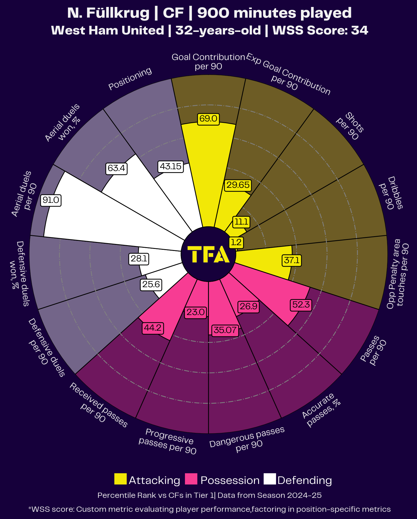 This means that the arrival of Füllkrug would guarantee much greater ability to disrupt opposing defences, win aerial duels, and eventually build attacking plans on that.