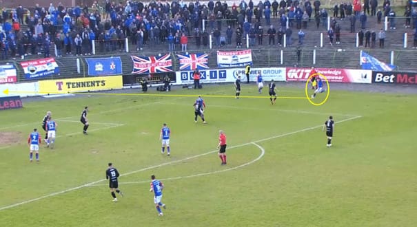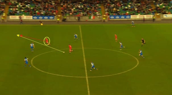 He picks up the ball and drives forward, driving past several opponents before passing the ball off to one of Linfield’s attackers.