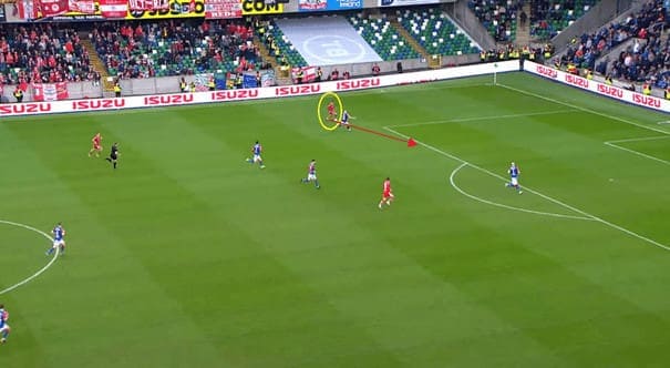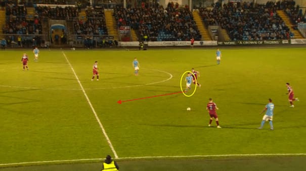 In this example, Hale drives takes the ball past the pressing right back with his first touch as the next defender charges in, Hale nutmegs his opponent before driving forward and playing a pass into the box for his centre forward partner.
