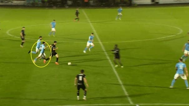 He then drives at the opposition’s defence, going by another opponent, who then fouls Taylor, winning a free kick on the edge of the box.