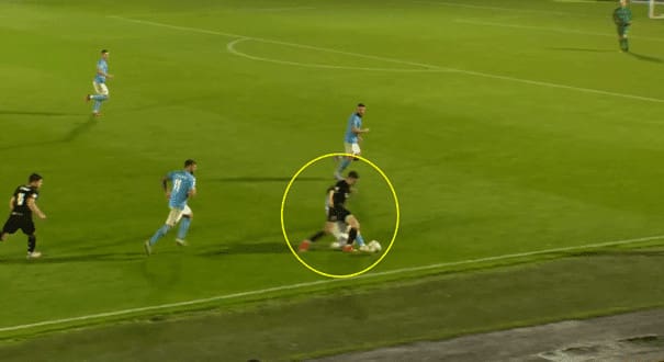 Taylor attempts to play the ball again, in between the opposition’s full back and central defender.