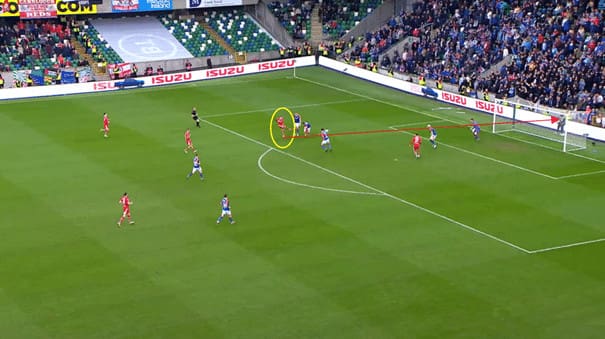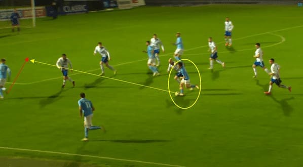 In this example, Taylor plays an excellent ball through the opposition’s backline into the path of a forward runner.