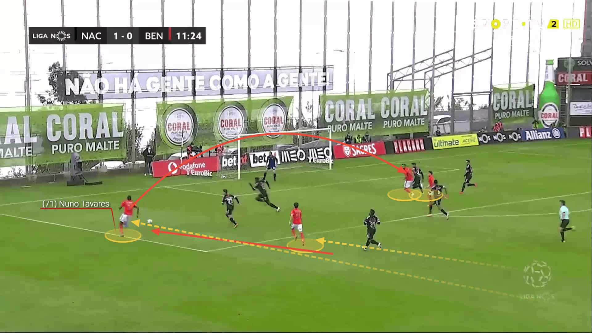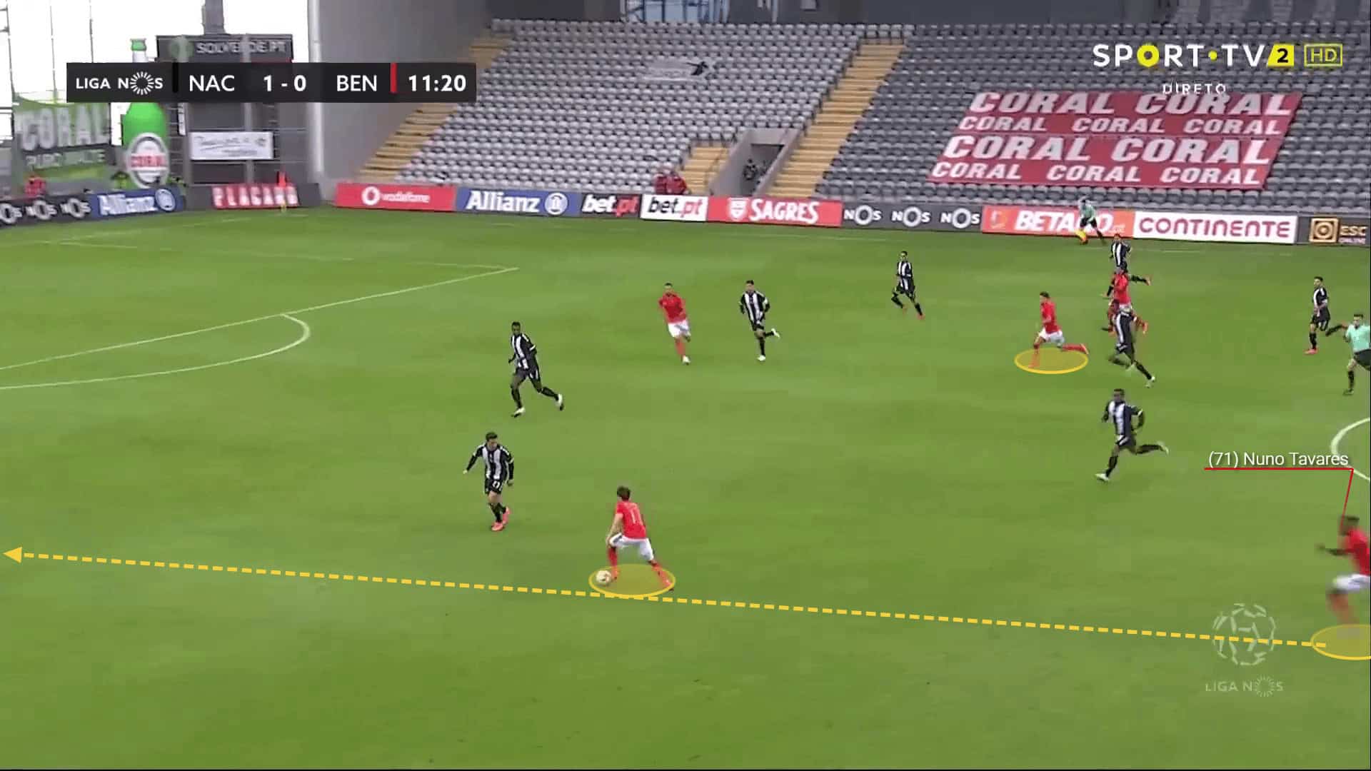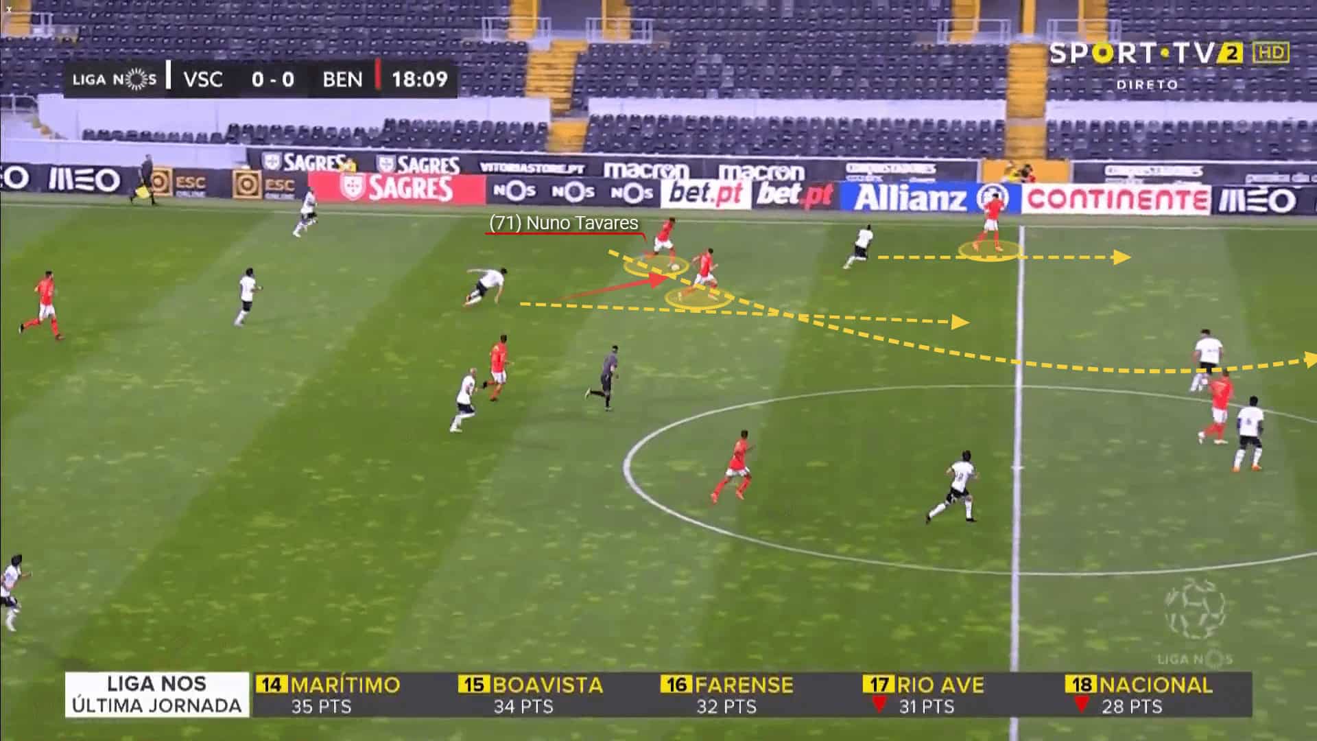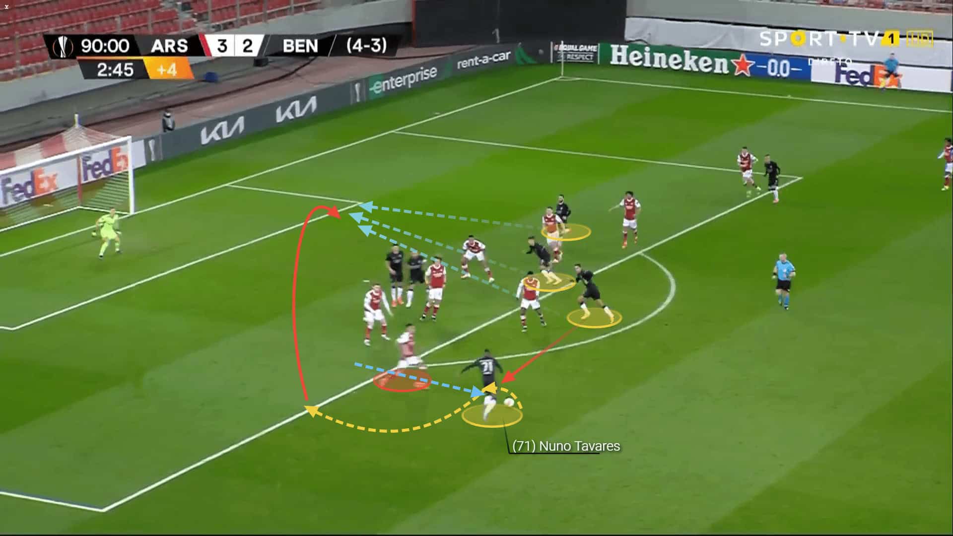 Even though he played only in 14 league games last season, that wouldn’t be something new to Tavares, as Benfica’s attacking actions were focused on the flanks as well. His advanced positioning helped the team in controlling the games in the opposition half, something that Arteta tried to implement at Arsenal but was lacking the squad quality and the defensive stability to succeed.