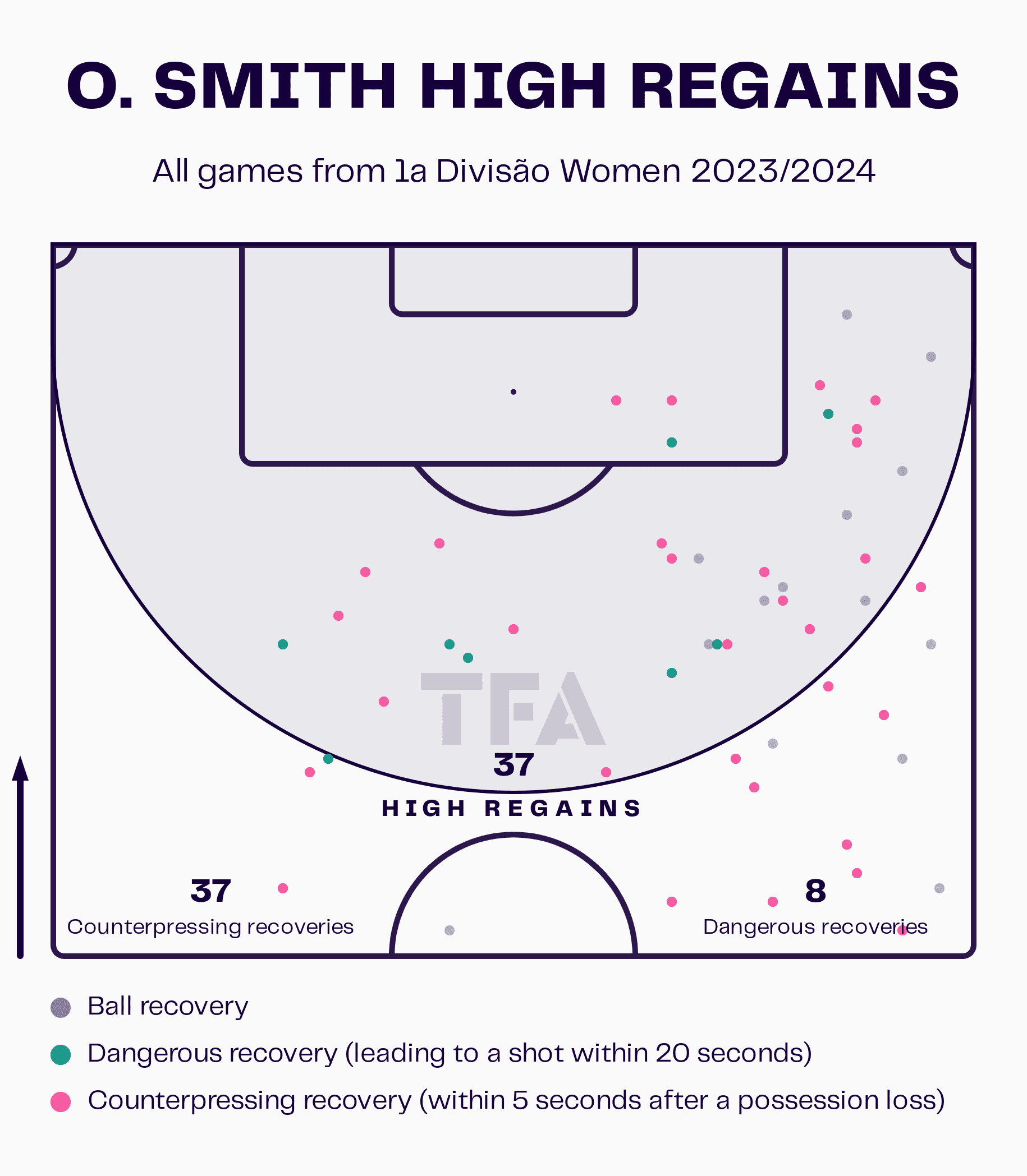 However, perhaps most intriguingly for interested pursuers, Smith has demonstrated the ability to win the ball high up the field in dangerous goalscoring positions, as demonstrated by the 37 high regains she has made this season.