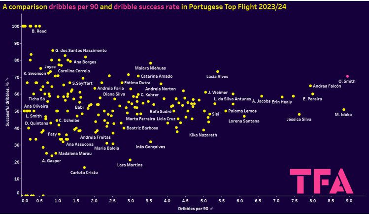Dribbles per 90 indicate the body of work she is getting done in a match, while the dribble success rate establishes how wasteful, in Smith’s case, she is when dribbling.