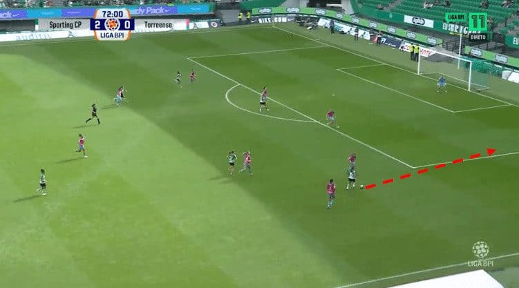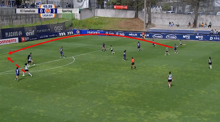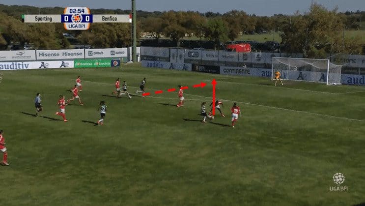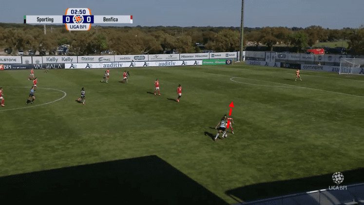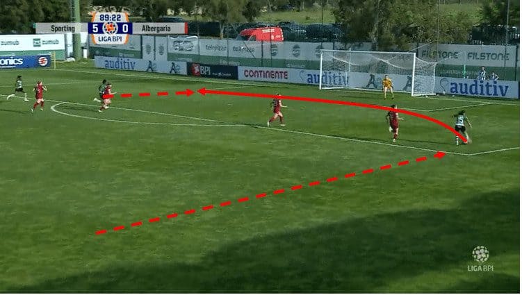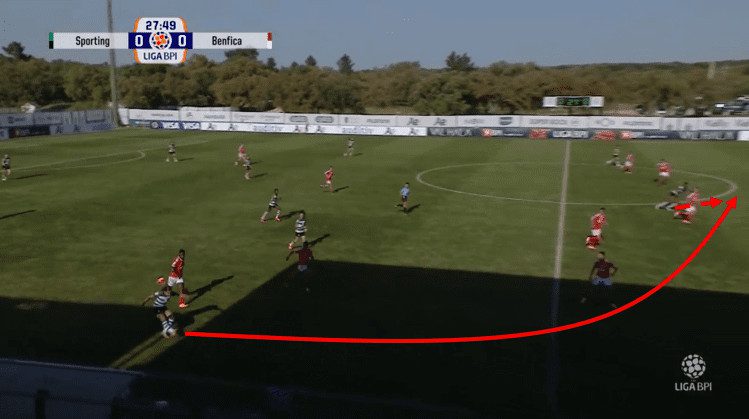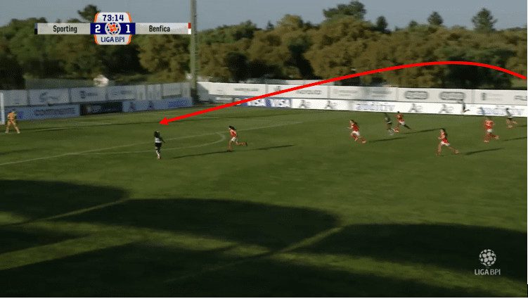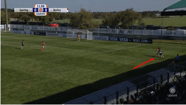 In this situation, Smith finds herself in a one-on-one situation with the Benfica left-back out wide.