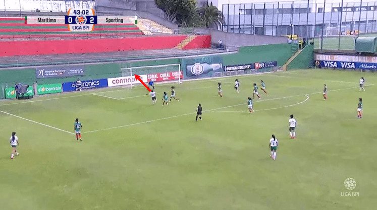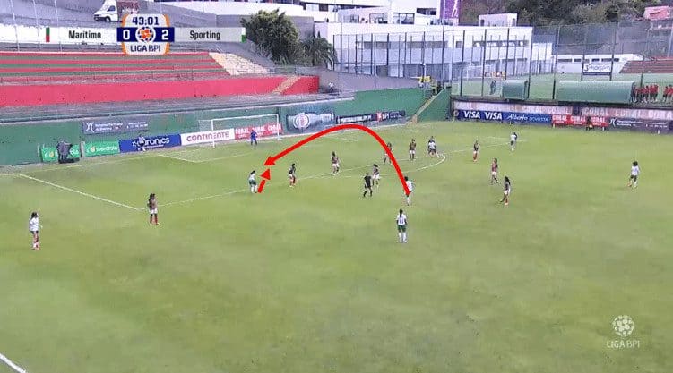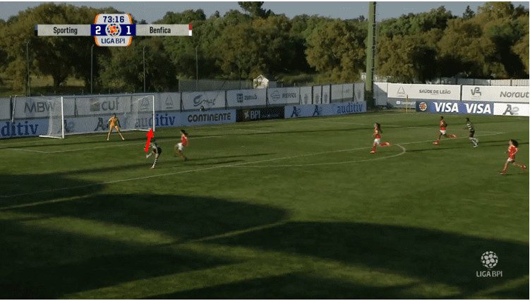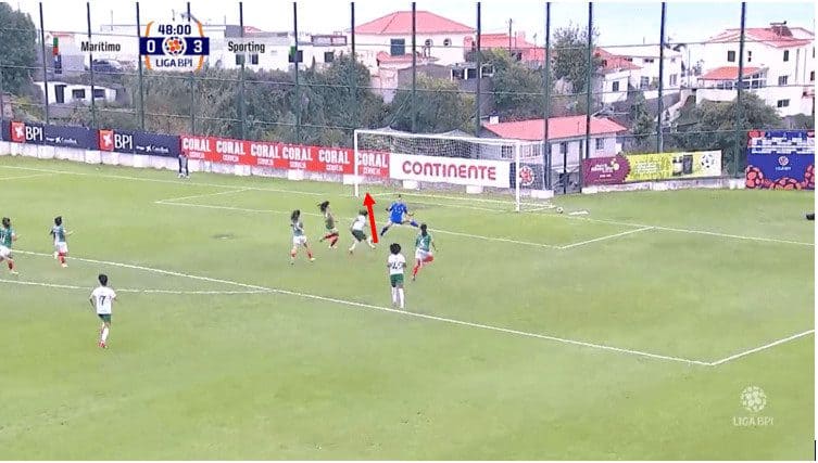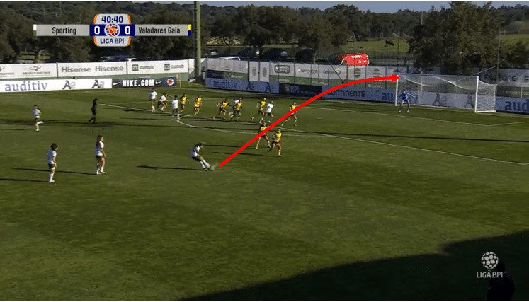 In a deep position, she identifies the run towards the back post by teammate Leonete Correira.