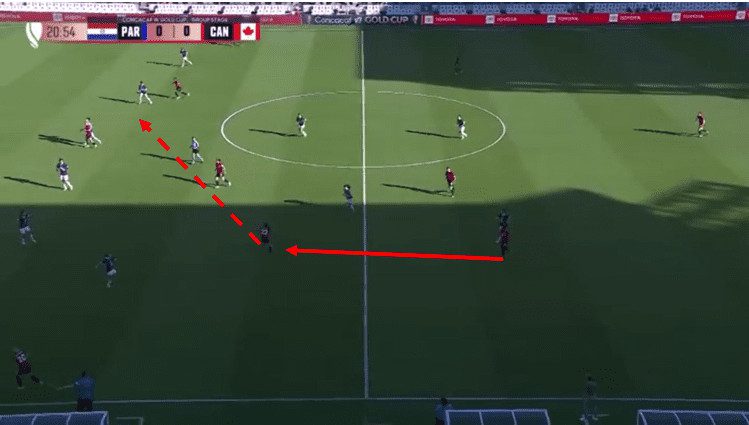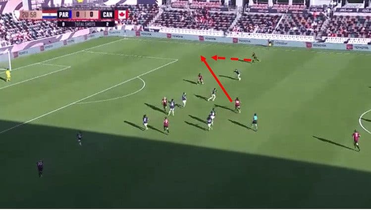 Here, she is able to see the run being made by her centre forward, Raphino.