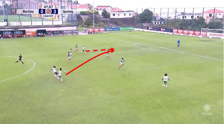 Here, Smith makes an outside run from the left wing and is able to get in behind the Maritimo defence.