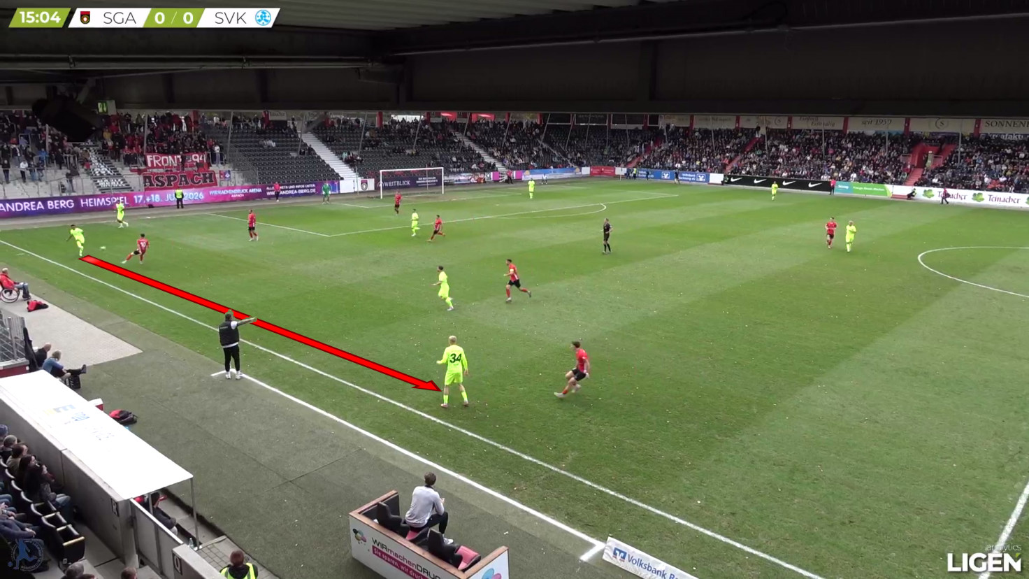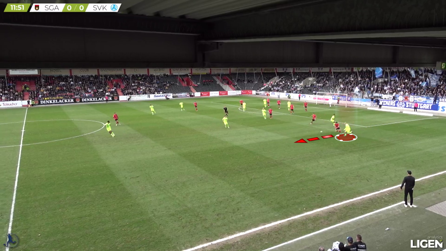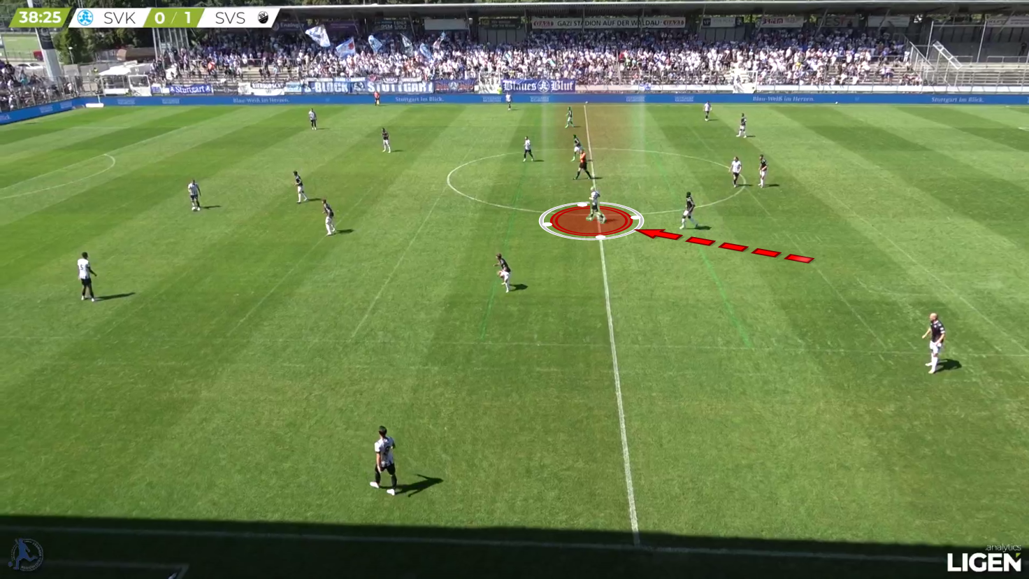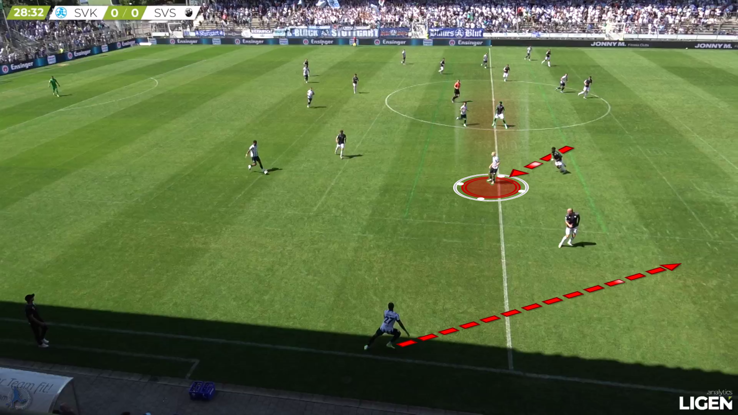 Here, the pass gets played into the other direction, but Hencke quickly shifts to the inside and covers off the diagonal passing option.