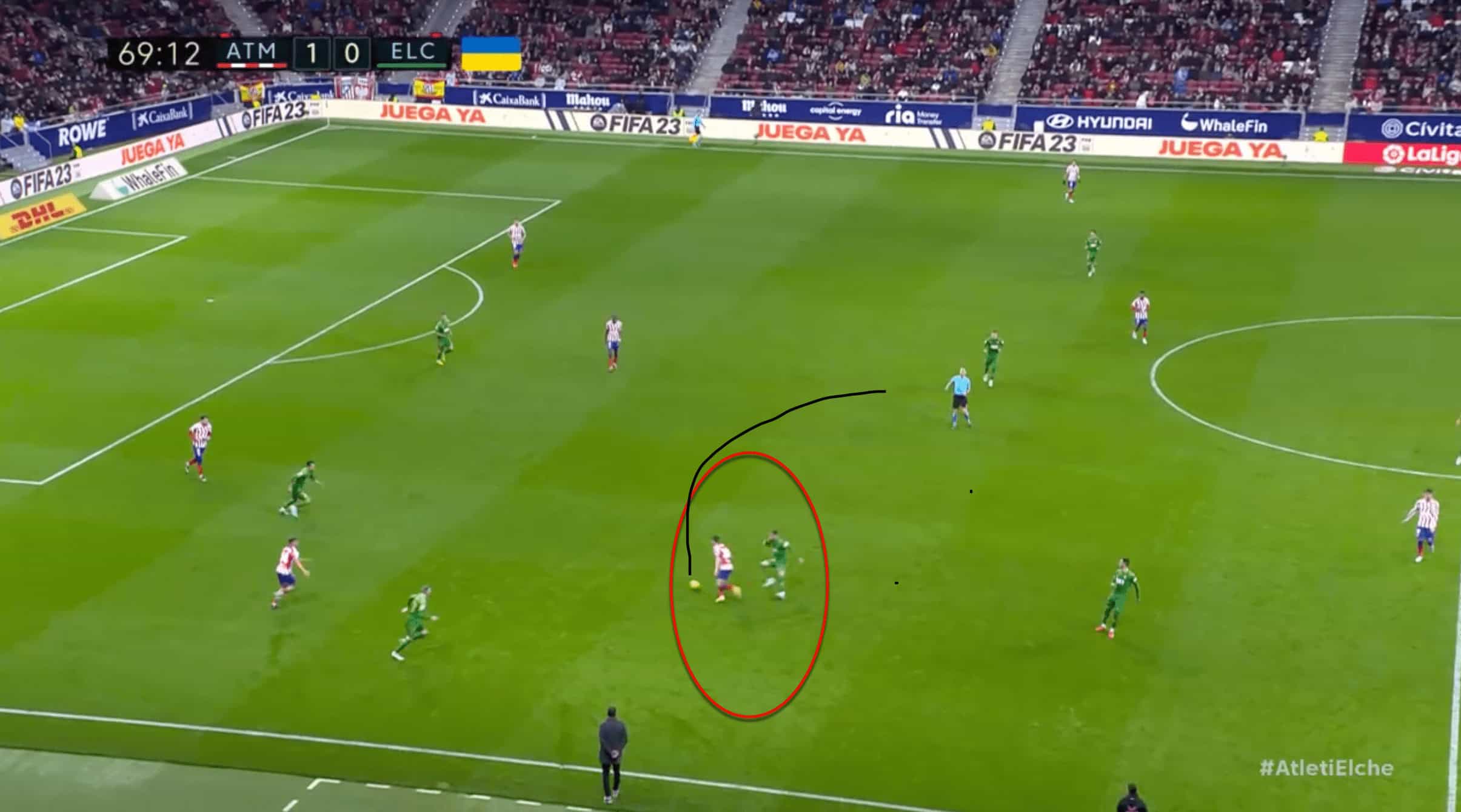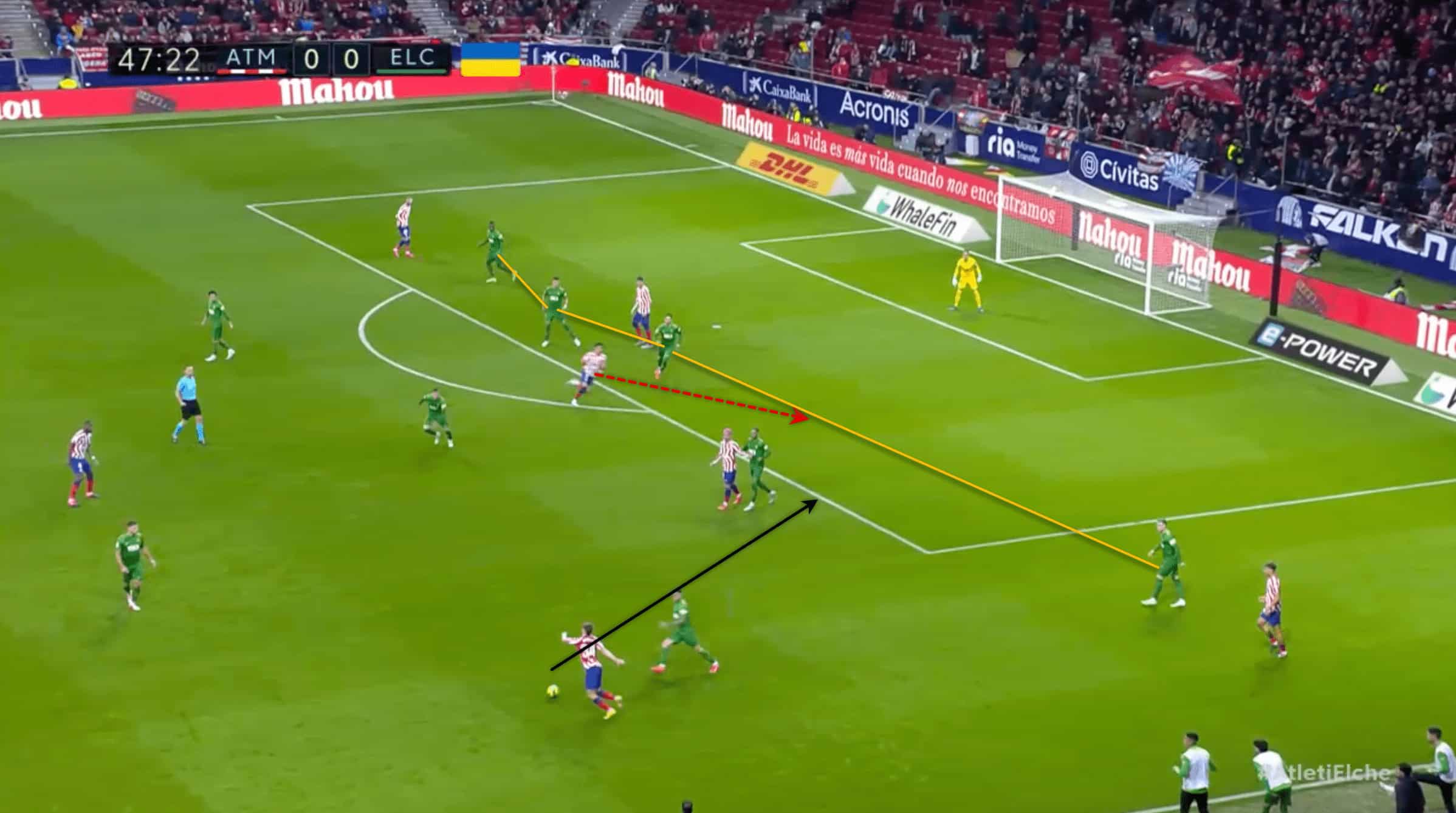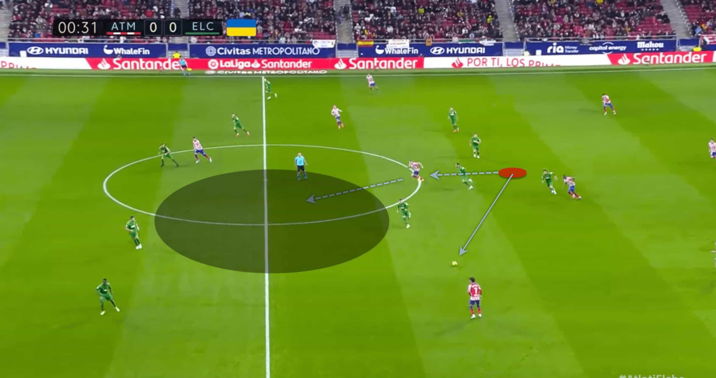 As a side that likes to sit back and rely primarily on counter-attacks, Barrios has given Simeone food for thought in terms of how and what to reorganise. In the accompanying image, you can see how Barrios exploits a gap he identifies between Elche’s left central defender and the full-back, setting up a penetration by João Félix.