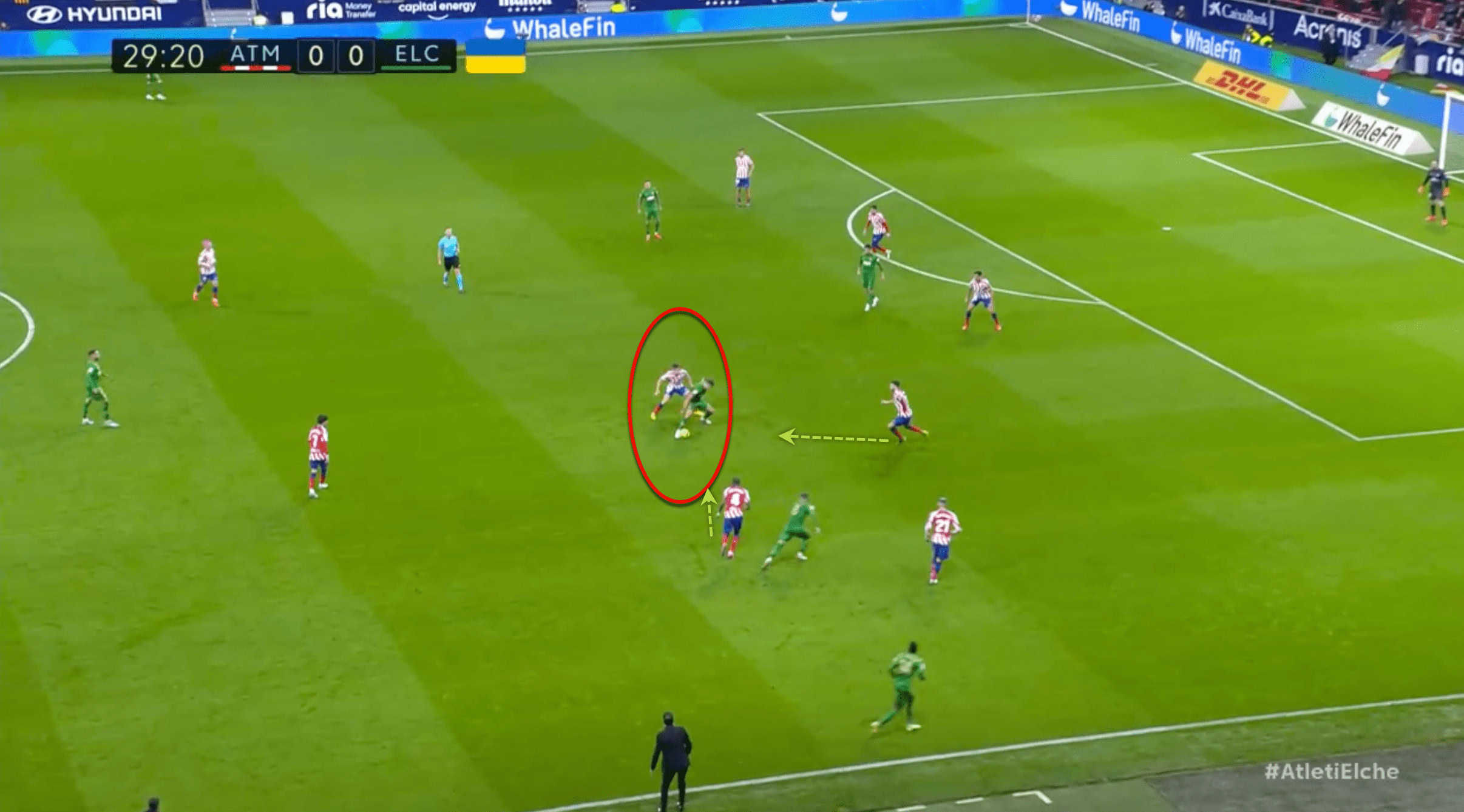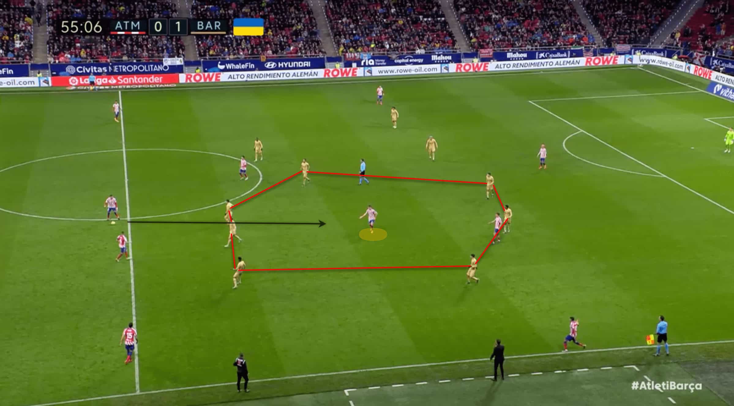 Barrios was the only player in the middle of the field who consistently opened up passing lanes to the attacking third in the game with the Catalans. Barrios’s addition improved the effectiveness of the midfield, which had been underutilised by Simeone due to his preference for playing the wingers well wide to the line.