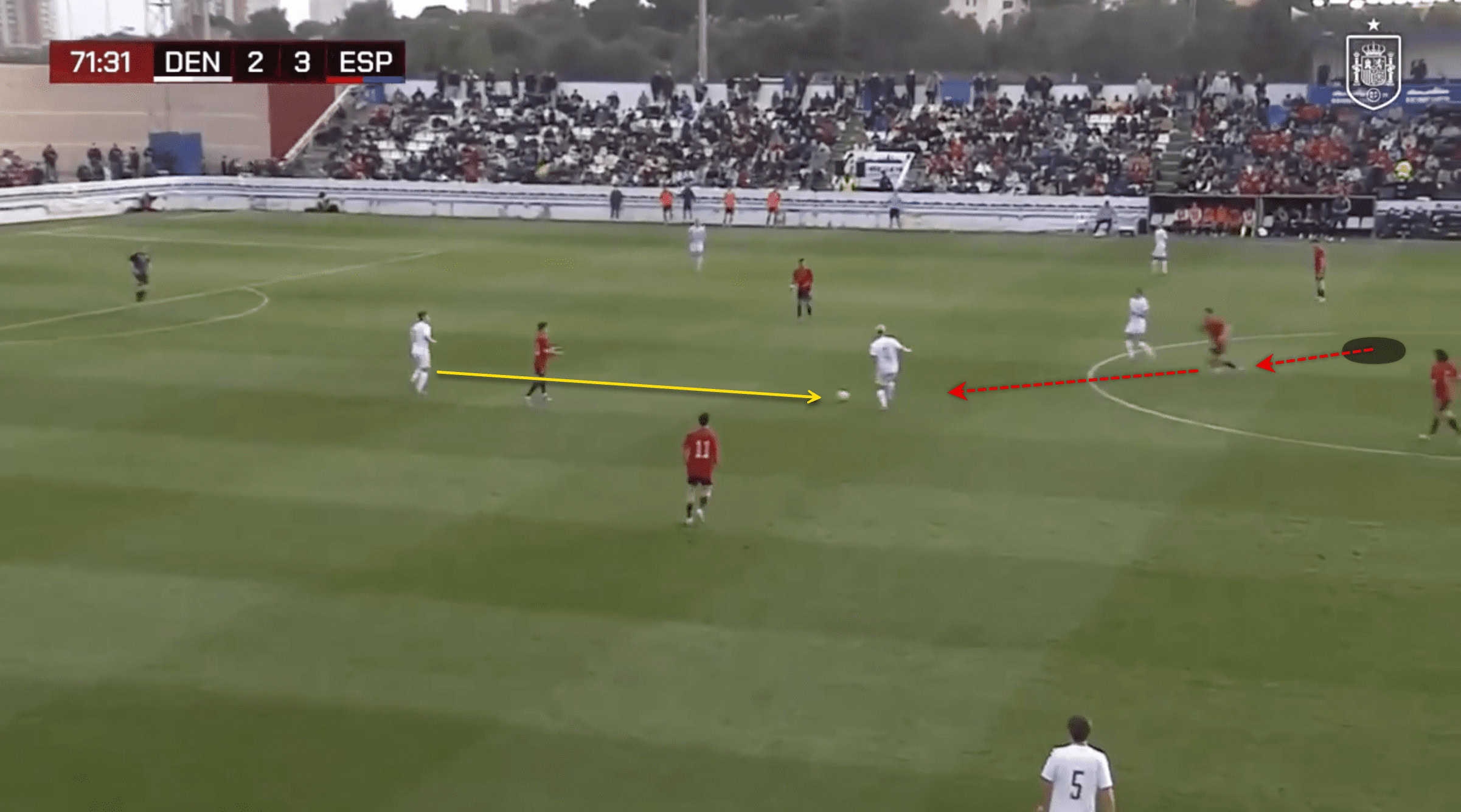 Barrios was a good fit for Spain’s pressing and defending high strategy in the U-19 UEFA Championship Qualifying match against Denmark. The defensive midfielder, oblivious to his surroundings, is surprised when he is snuck up from behind. Barrios decides to commit without being explicit about it, and this turns out well. He’s successful in the press, and now the counterattack has begun.