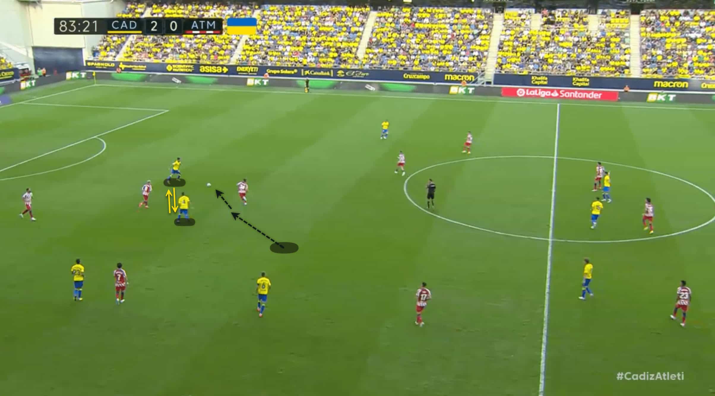 Cádiz’s midfielder would chase following two separate presses after receiving the ball back after he had passed. As the defender panicked and cleared the ball, his immediate effort paid off.
