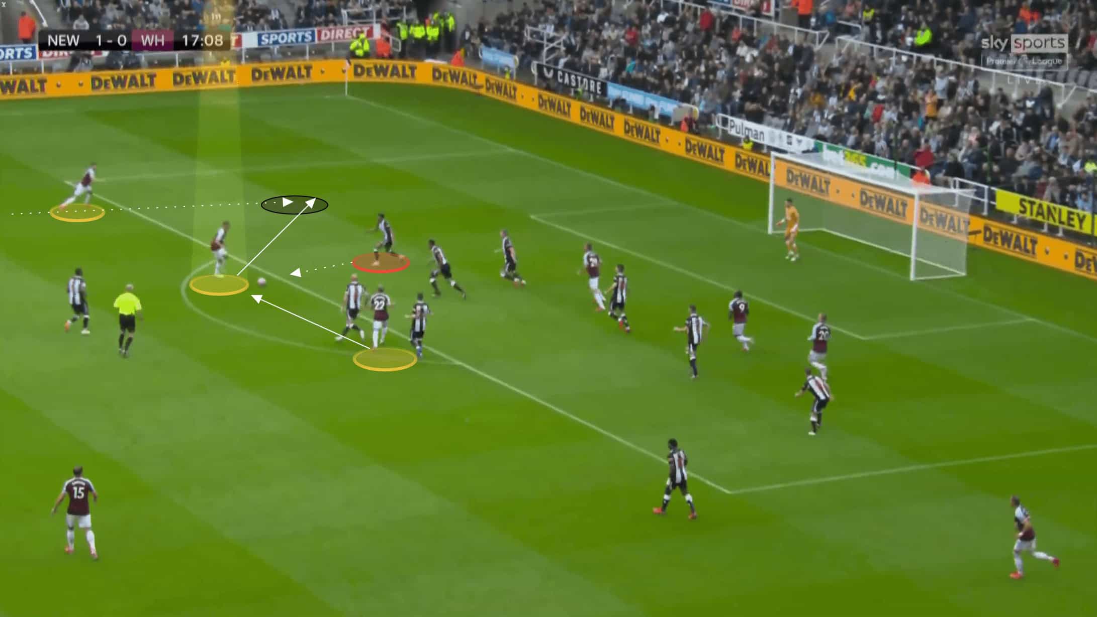 Just as noted before, Fornals knows where his next pass is going before receiving the ball, and once again his awareness of defenders looking to press him and the space around him can lead to him creating in the final third. In attacking situations where he has a limited time to play a forward pass, Fornals will have scanned well before receiving the ball and will anticipate the player behind him or around him hitting the open space. He did this for an assist against Newcastle. Receiving the flat pass he took a touch, drawing the highlighted defender towards him. On his second touch, he played in Cresswell on his outside, with the left-back slotting home in space.