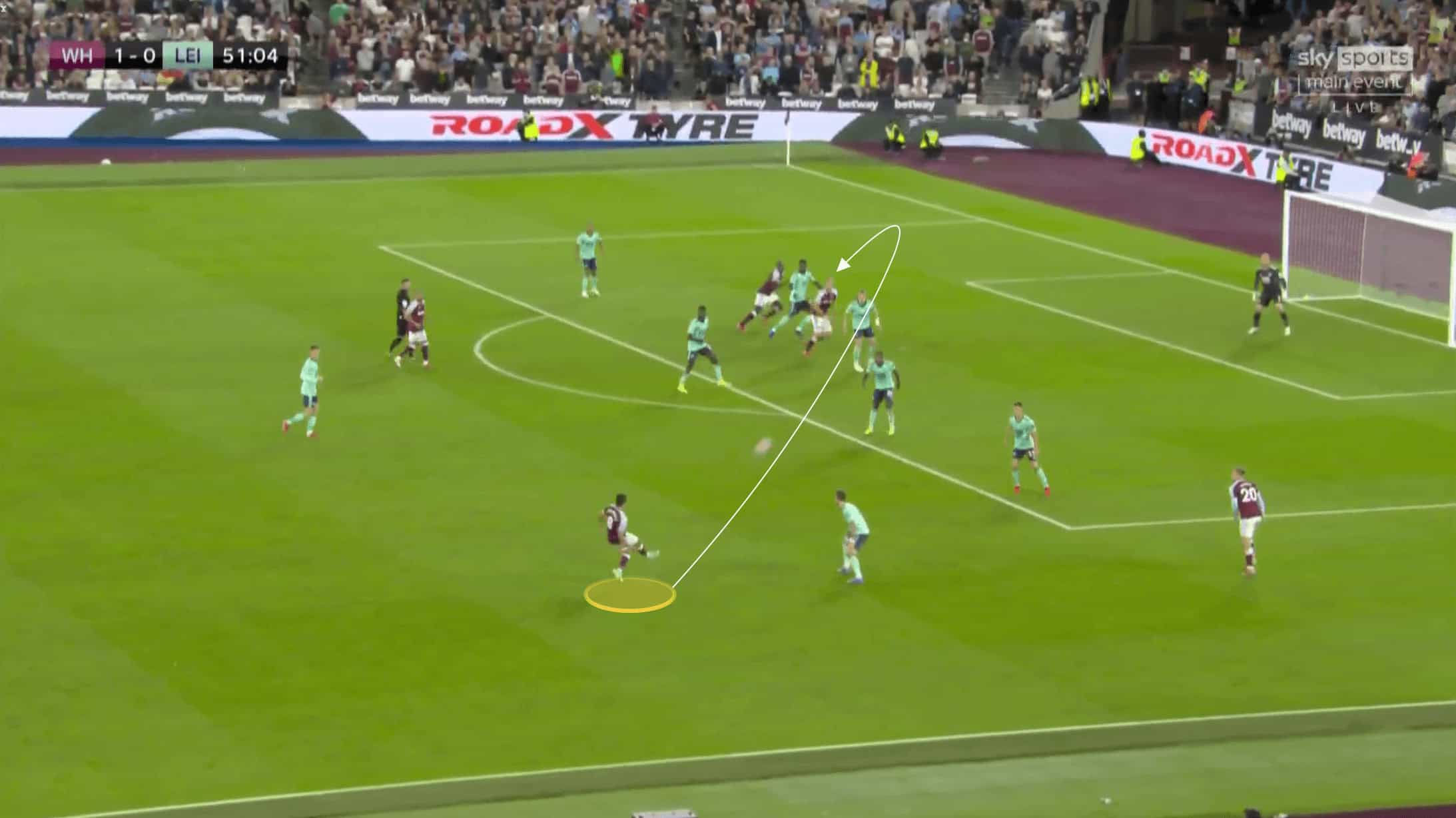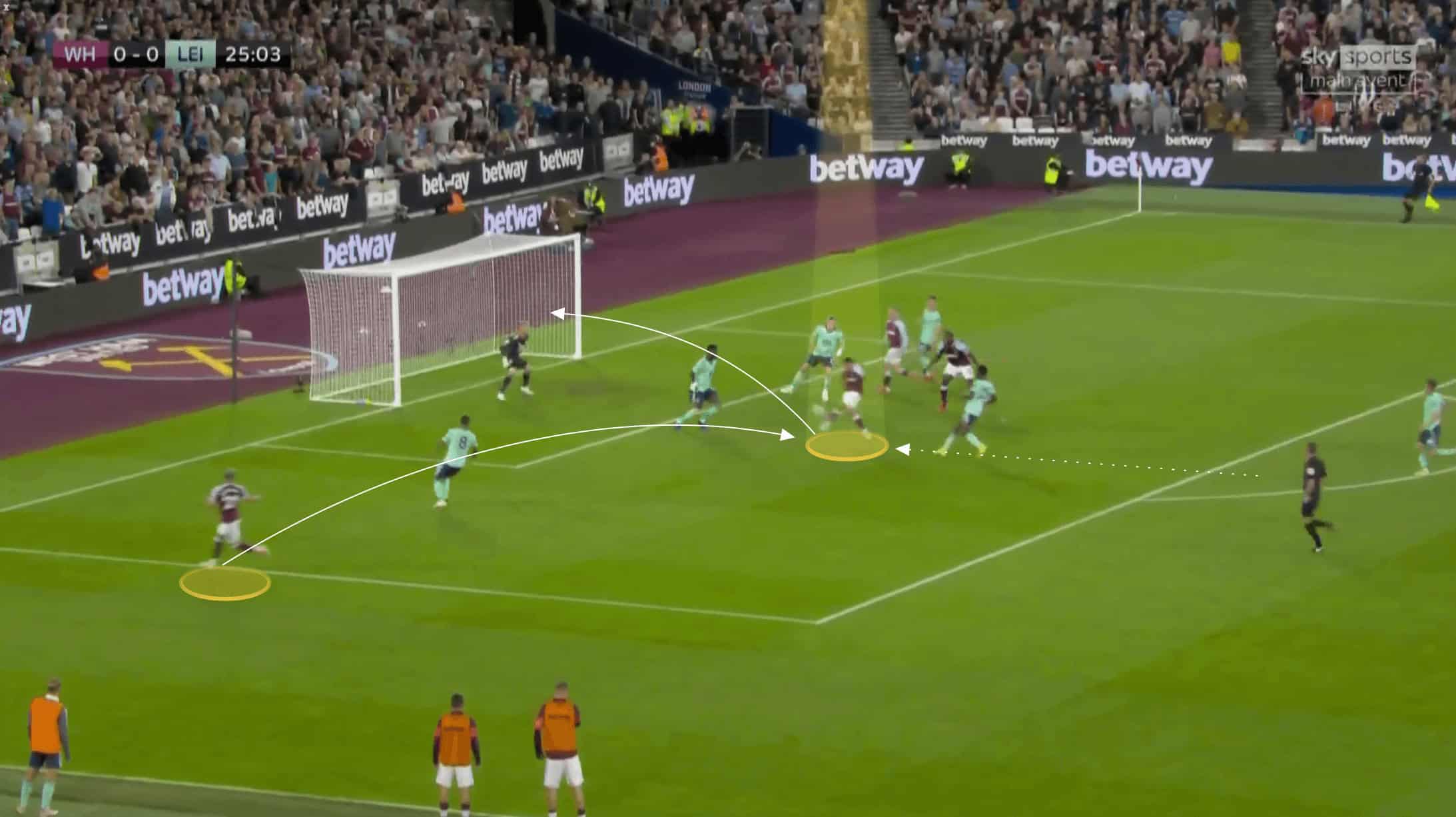 He shows quality movement in the final third, and whilst this can be down to him assessing space so well, and even using misdirection with his runs to create space between himself and his marker. It is perhaps mostly down to his quality timing. Fornals is able to read the flight of the ball well, which makes his late runs from midfield into the penalty area so lethal. This was how he was able to latch onto a cross to open West Ham’s scoring against Leicester early in the season. We can see this run in the image below as he finished first time with his left.
