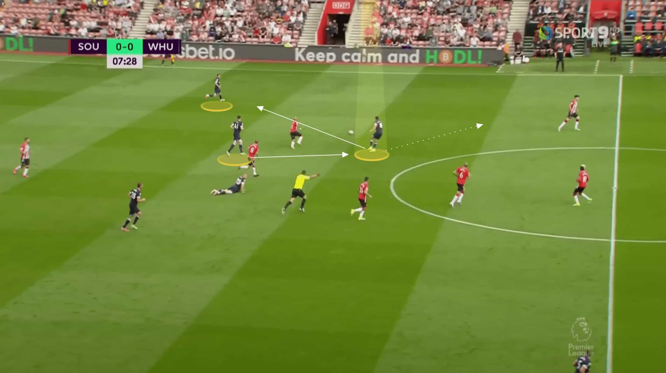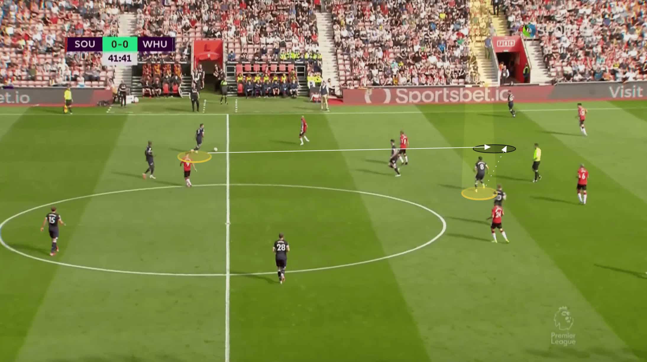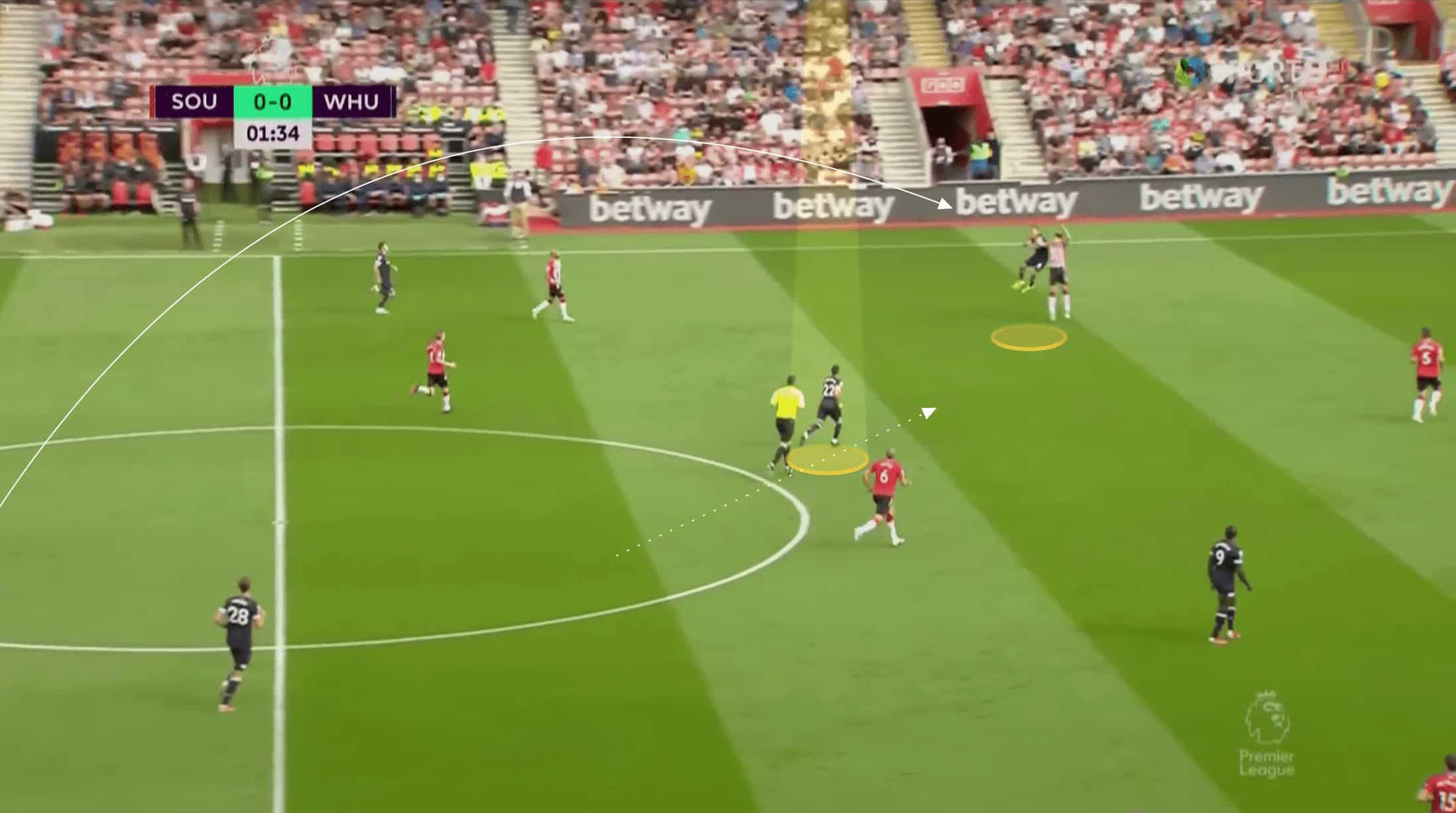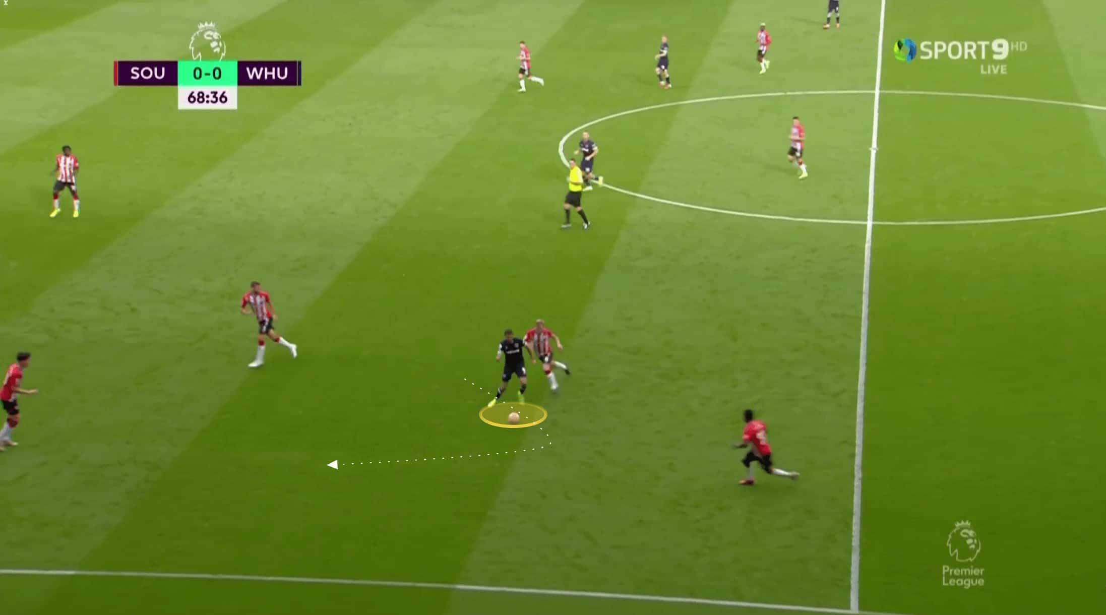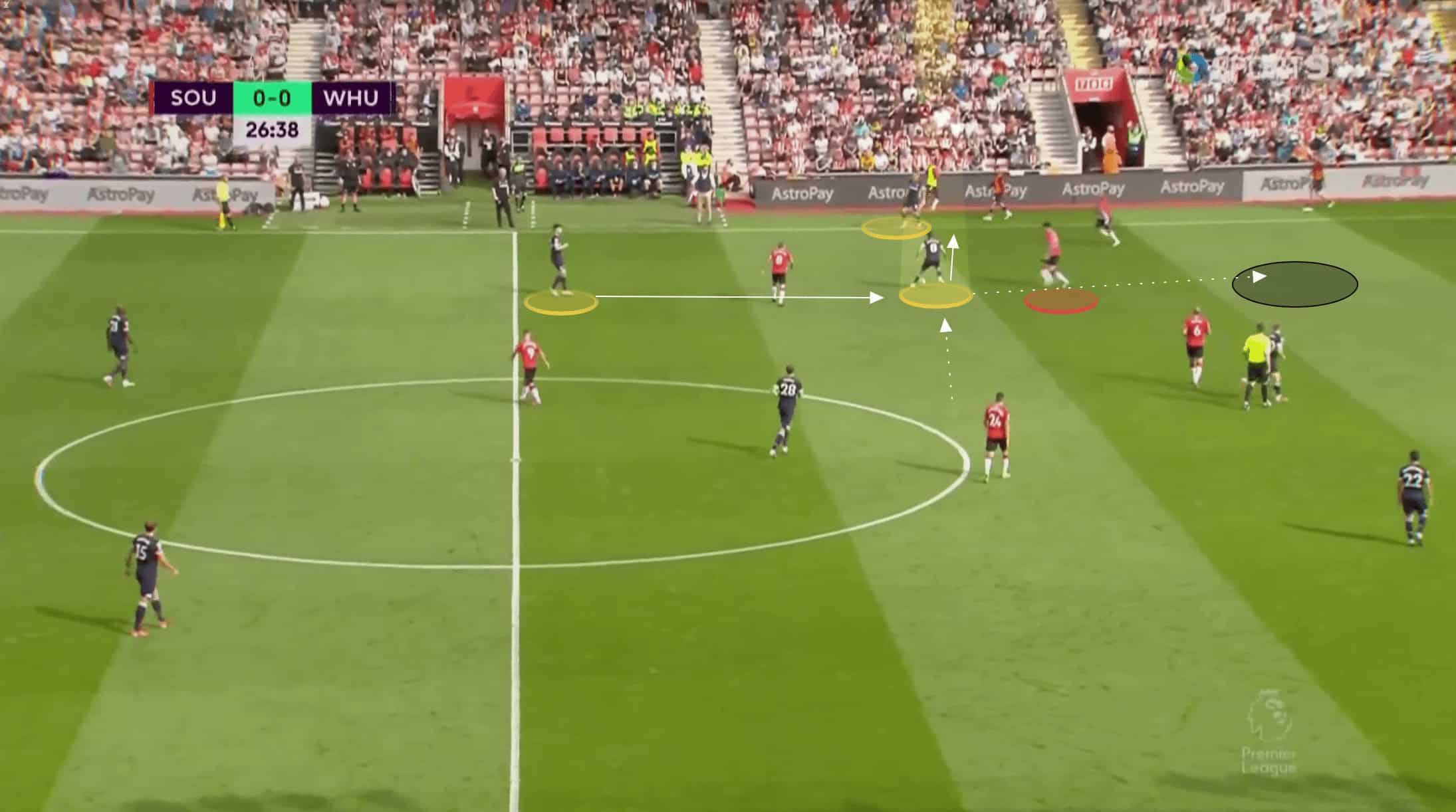 These most frequently come from him starting central, using the high positioning of left-back Aaron Cresswell to draw the opposition full-back slightly further forward, or at the very least occupy the opposition right-winger. If Cresswell doesn’t push forward then Fornals will happily rotate with midfield teammates, having them occupy the left flank whilst he sits inside. This pattern occurs in the image below.