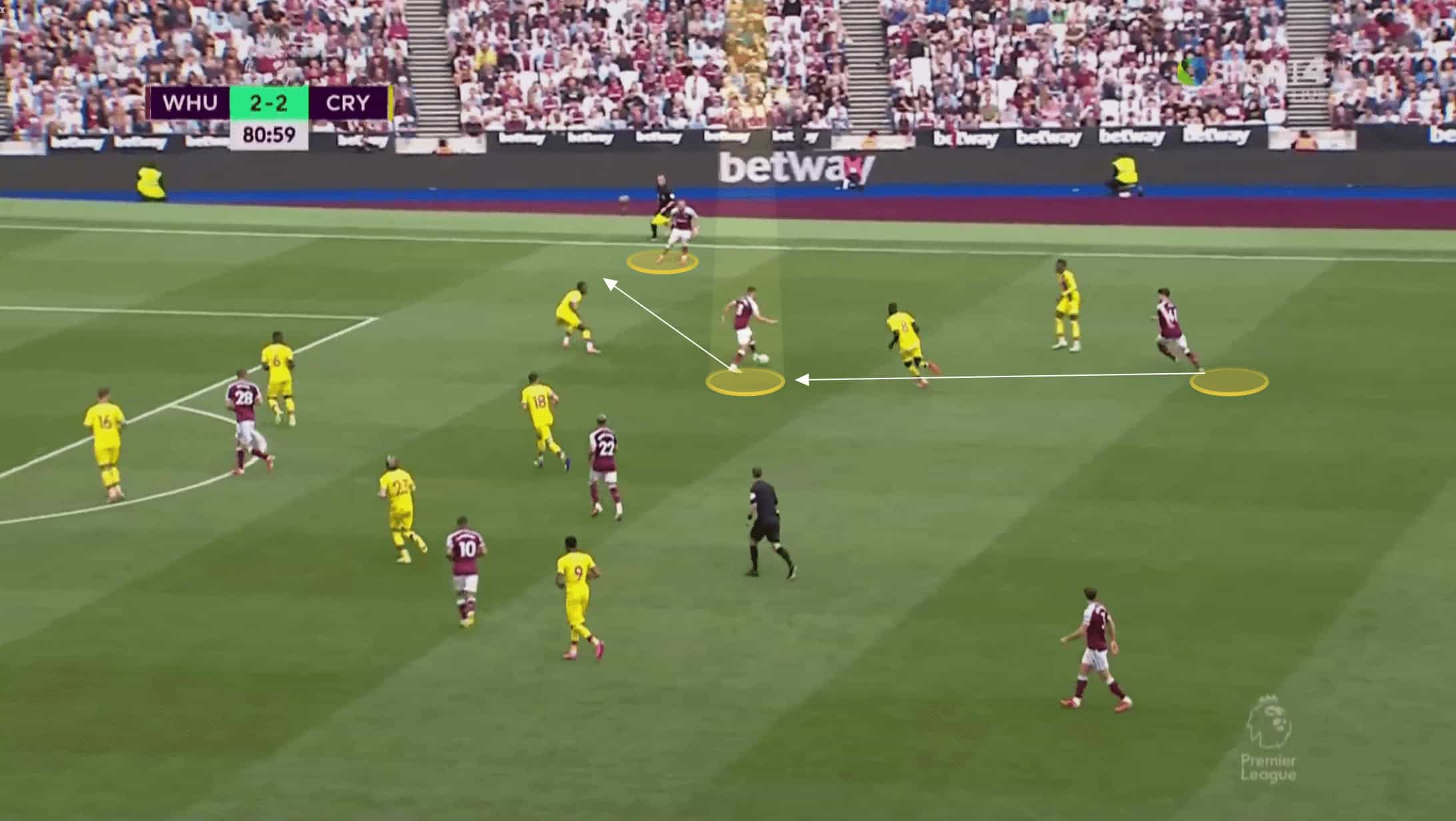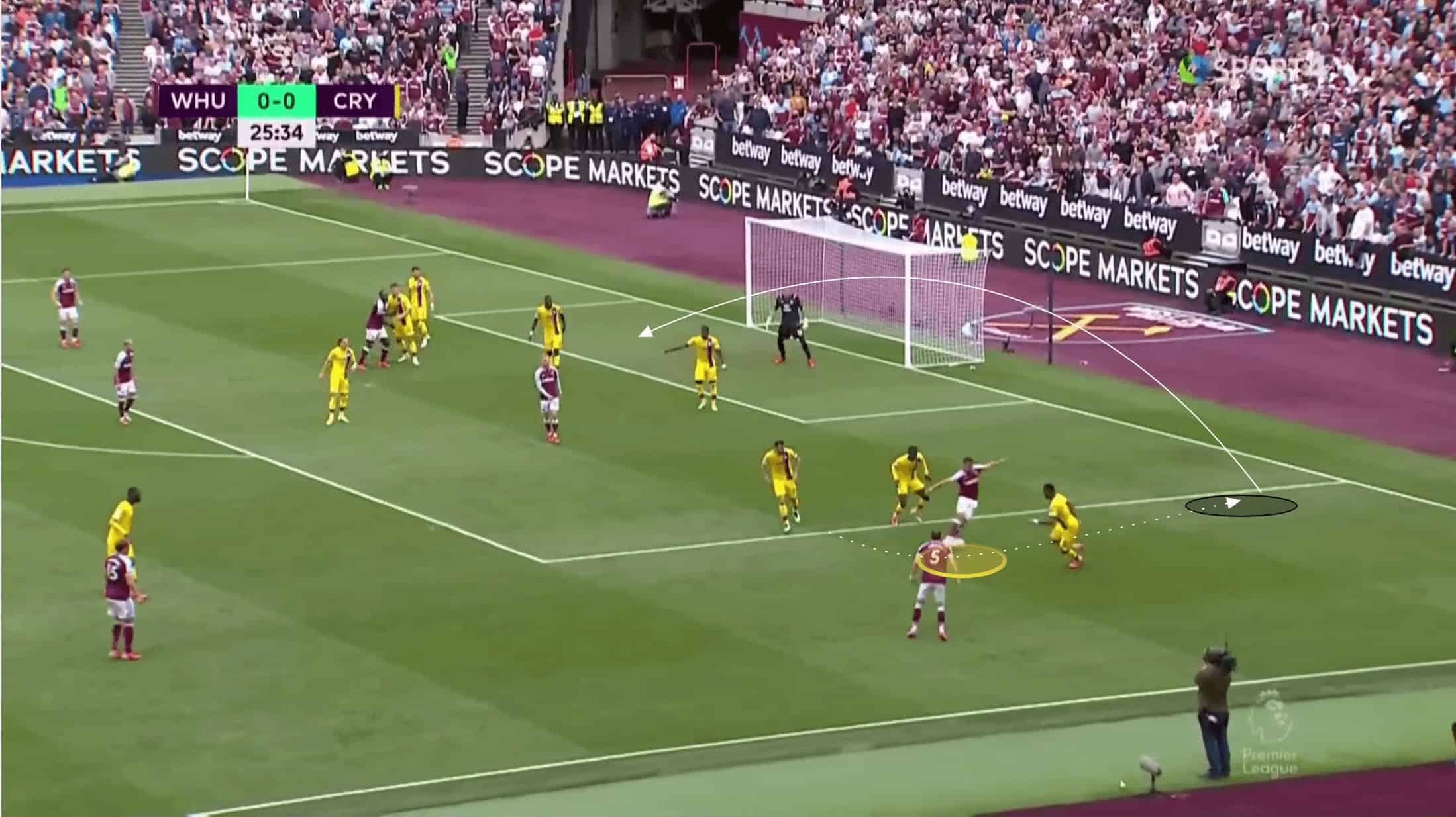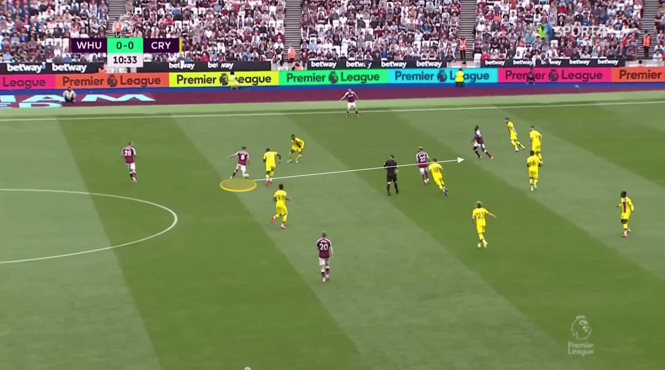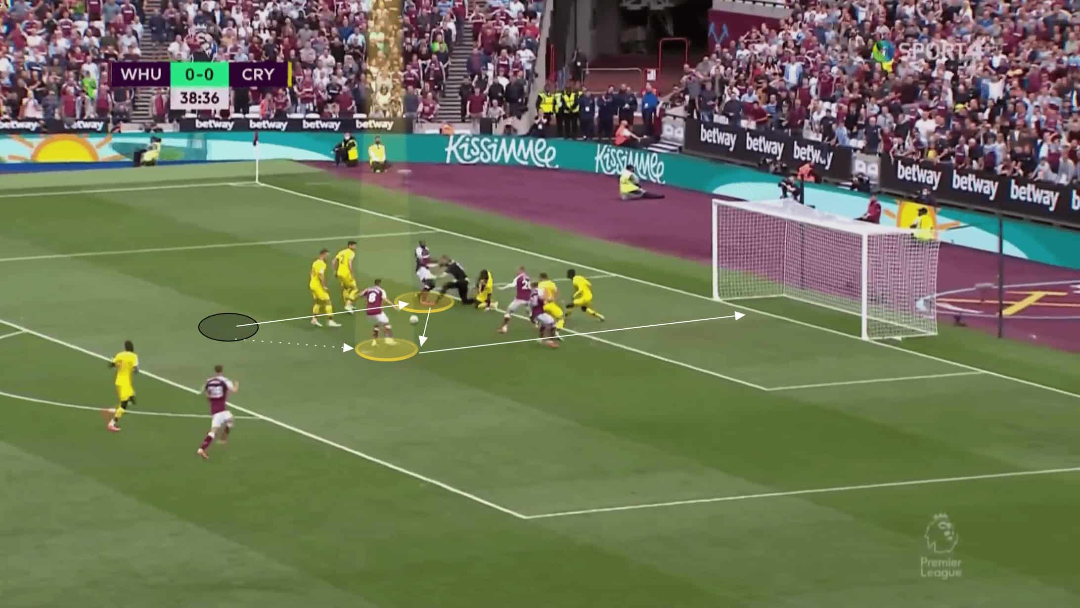 Fornals was able to score against Crystal Palace, playing a cute one-two with Antonio inside the area, finding a new space inside the box to receive the pass back and score from close range, despite having to navigate a crowded Palace box.