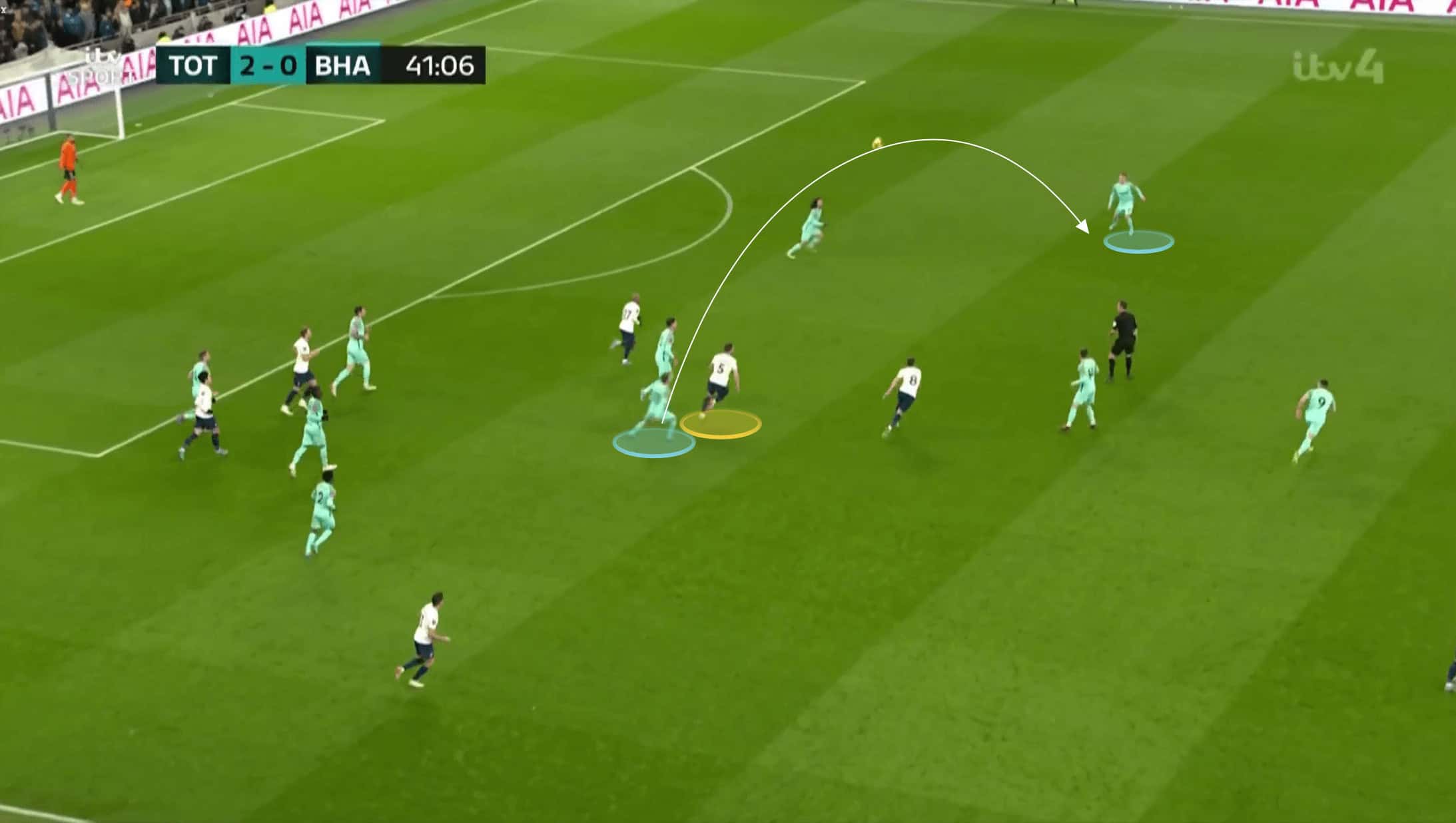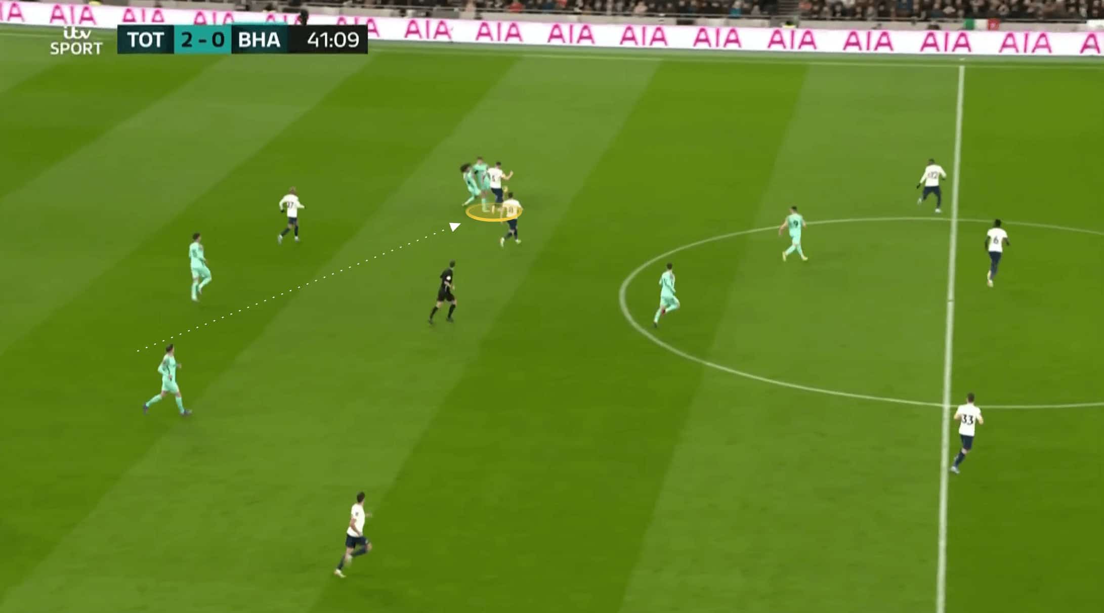 The example shown below shows him quickly covering space across the pitch before Brighton can secure possession, cutting out the pass and preventing Brighton from being able to orchestrate any kind of swift counter-attack.