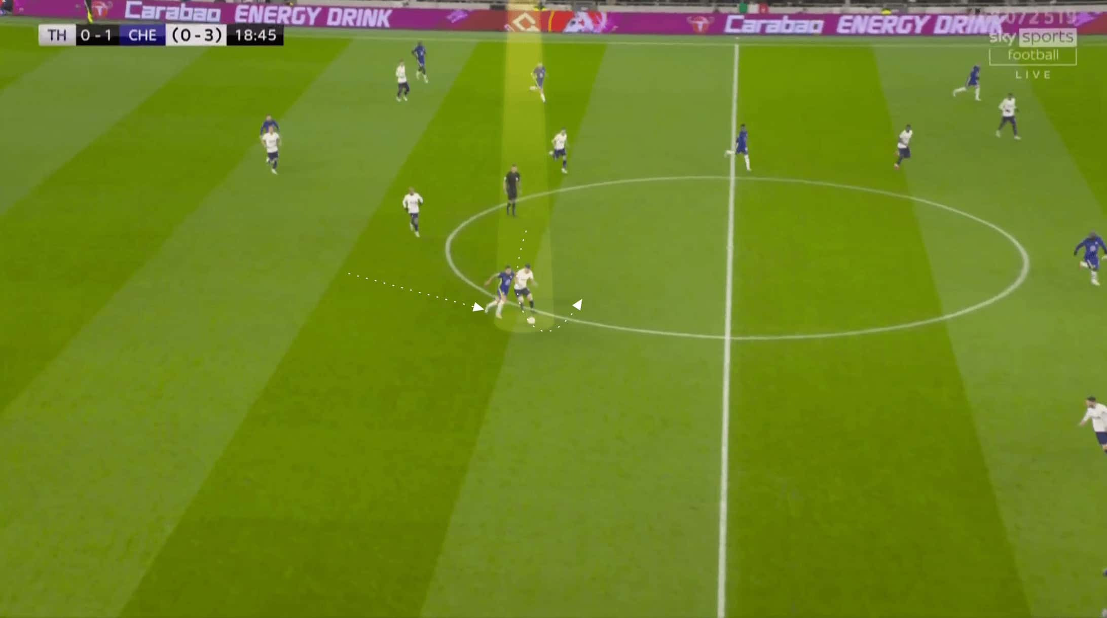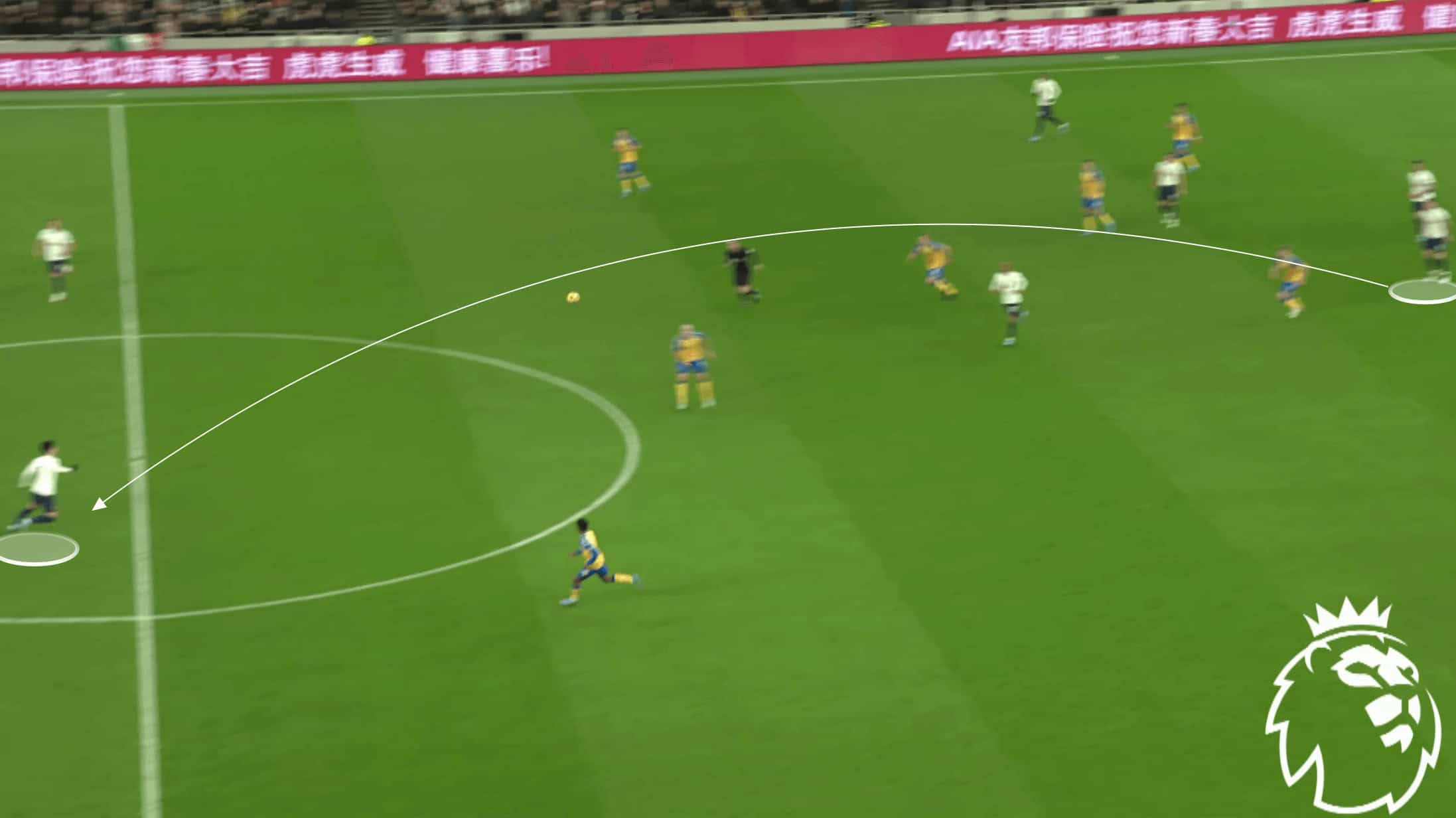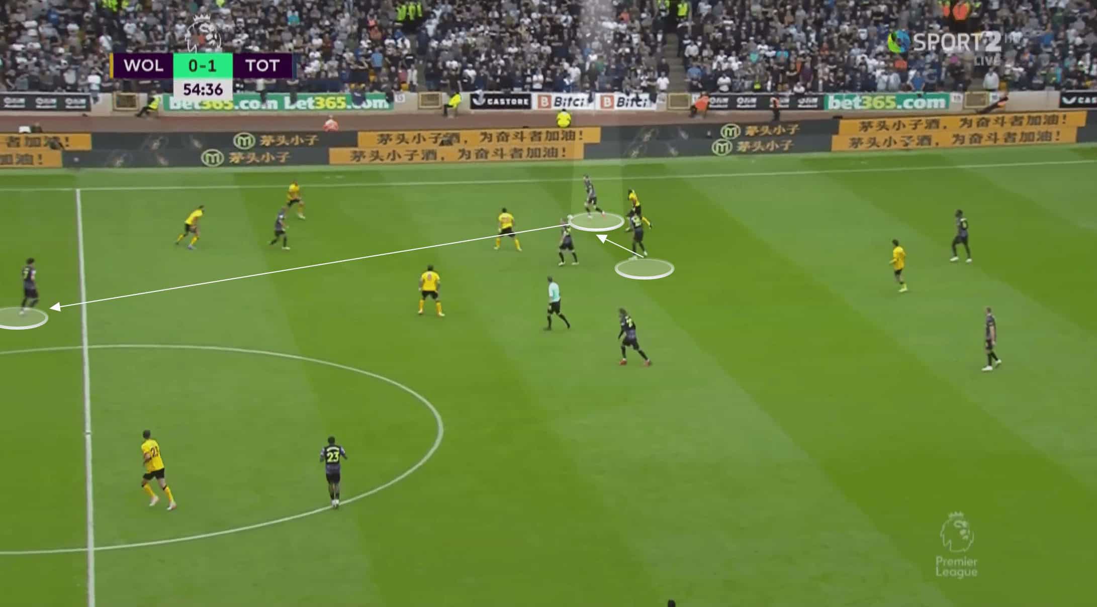 The following example comes after scanning, playing a direct pass forward into the feet of Heung-Min Son, not only getting the ball immediately away from any counter-press but also advancing the ball into an advantageous attacking position.