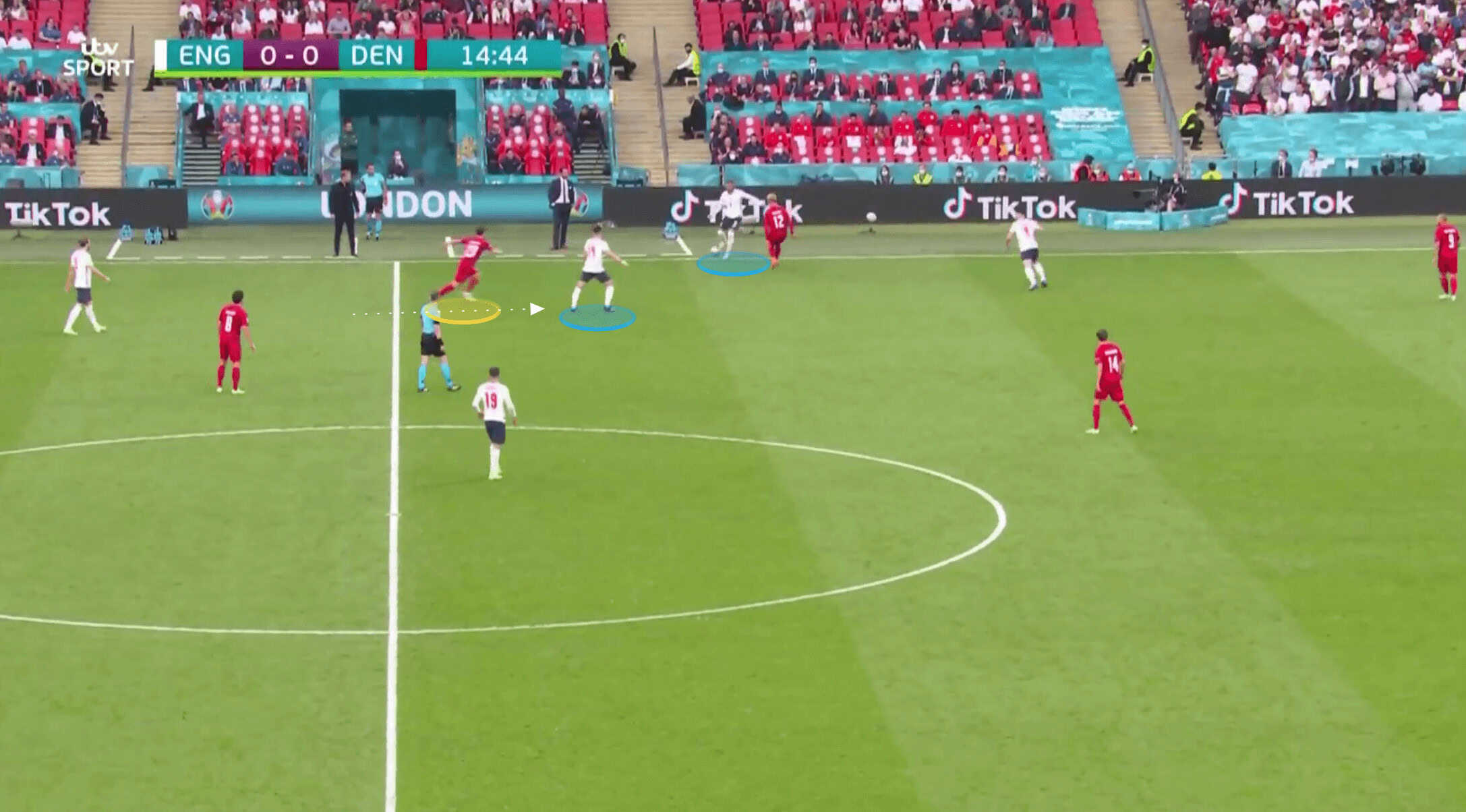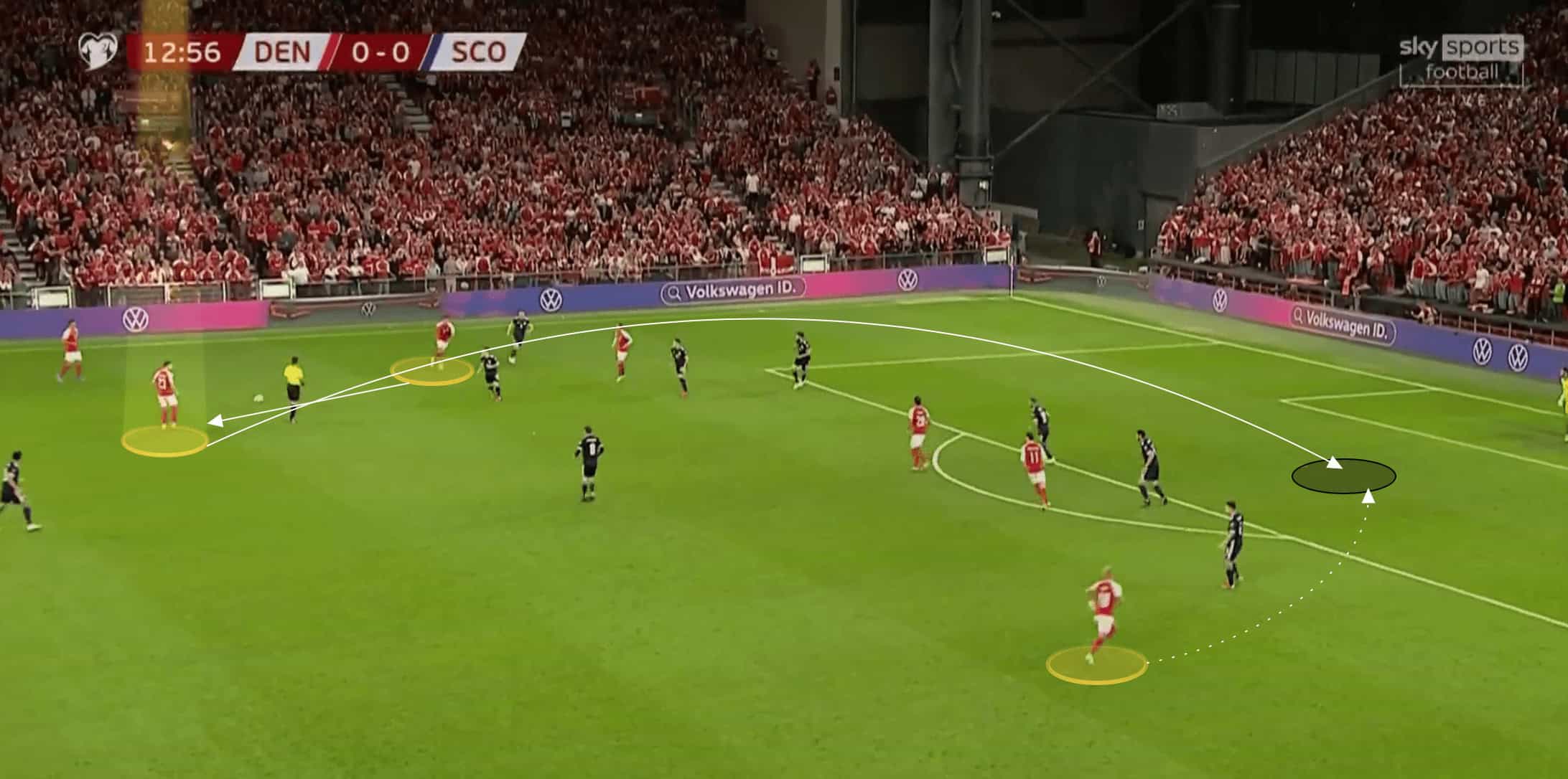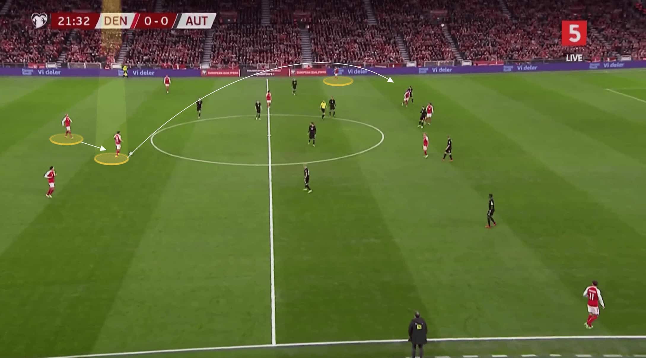 We can see him doing exactly this for Denmark in the following image, where he is in a very deep position, anchoring play, with his midfield and attackers positioned well ahead of him.