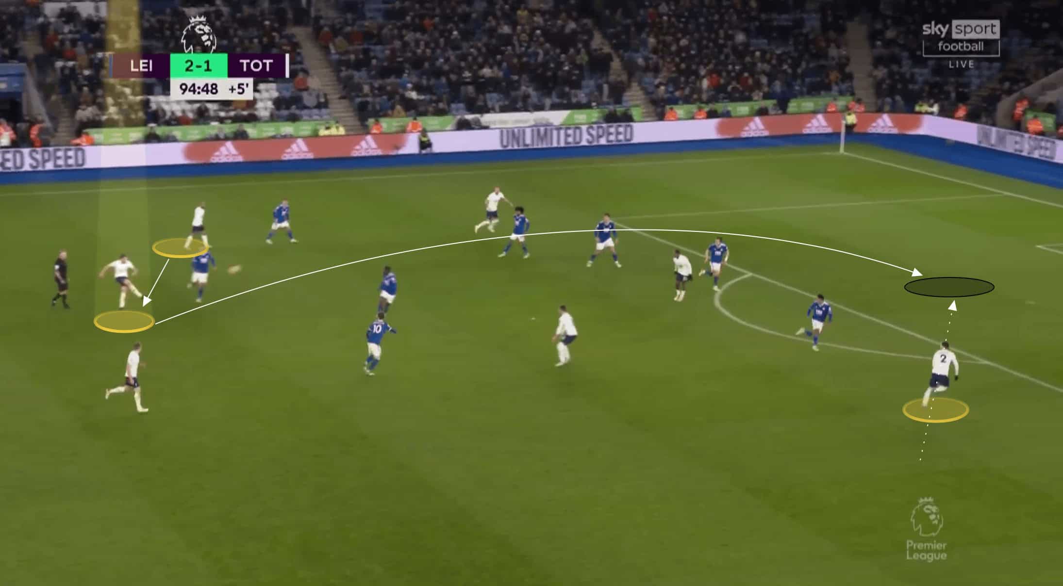 We can see this pass below, with him importantly angling the ball towards goal, making it difficult for the Leicester left-back to watch the ball and the man on his shoulder, and with it angling towards goal, Matt Doherty doesn’t have to check his run.