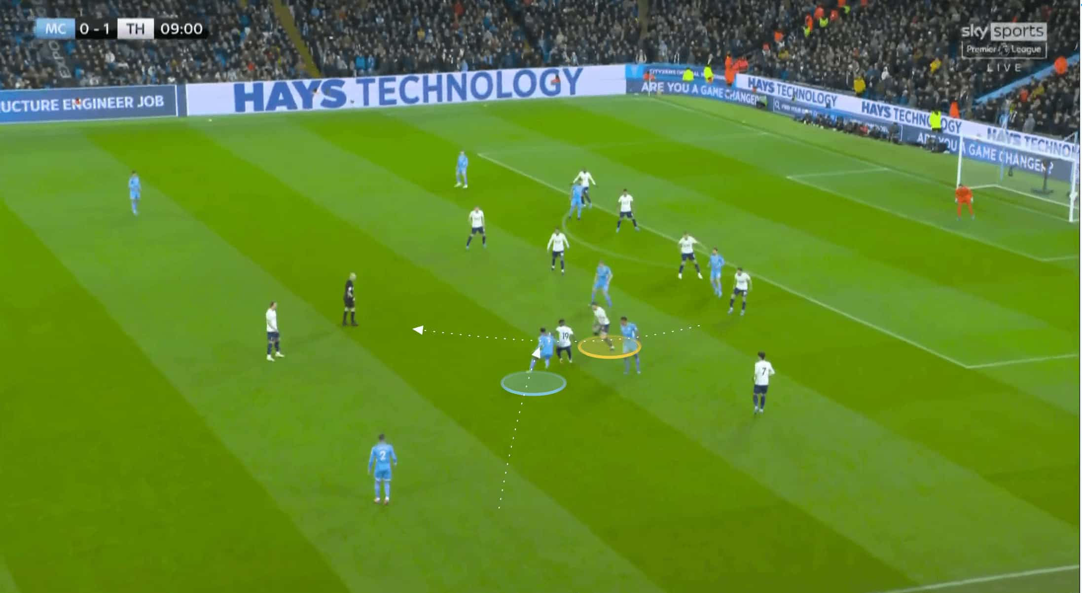 Below, he scans before receiving once more, immediately lofting the pass between the opposition left-back and centre-back for his winger to cut behind.