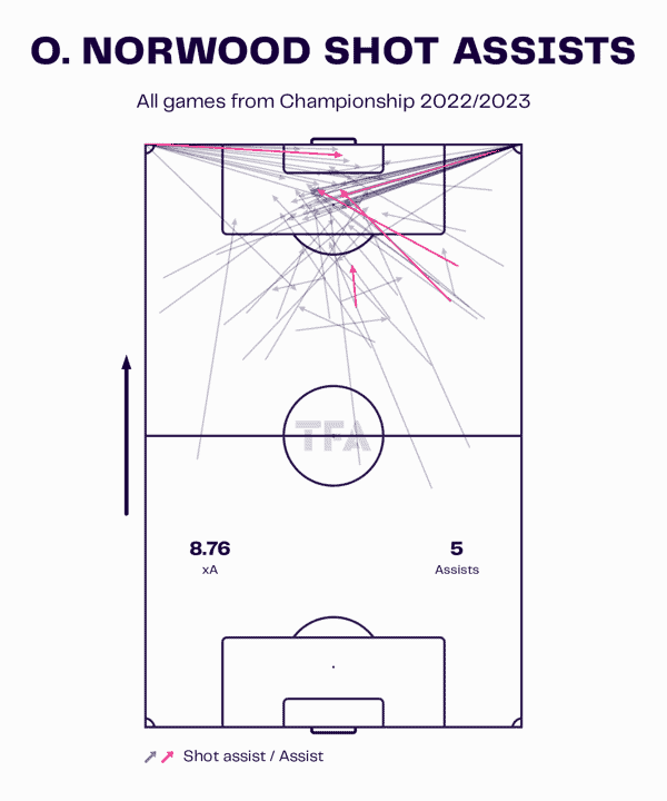 In 22/23, while playing in the Championship, Norwood enjoyed a more creative role, posting high percentiles for dangerous passes and being quite an attacking presence in the final third. He isn’t much of a ball carrier; instead, he prefers to move the ball forward via passes. His shot assist map above also demonstrates his creative ability, particularly at Championship level.