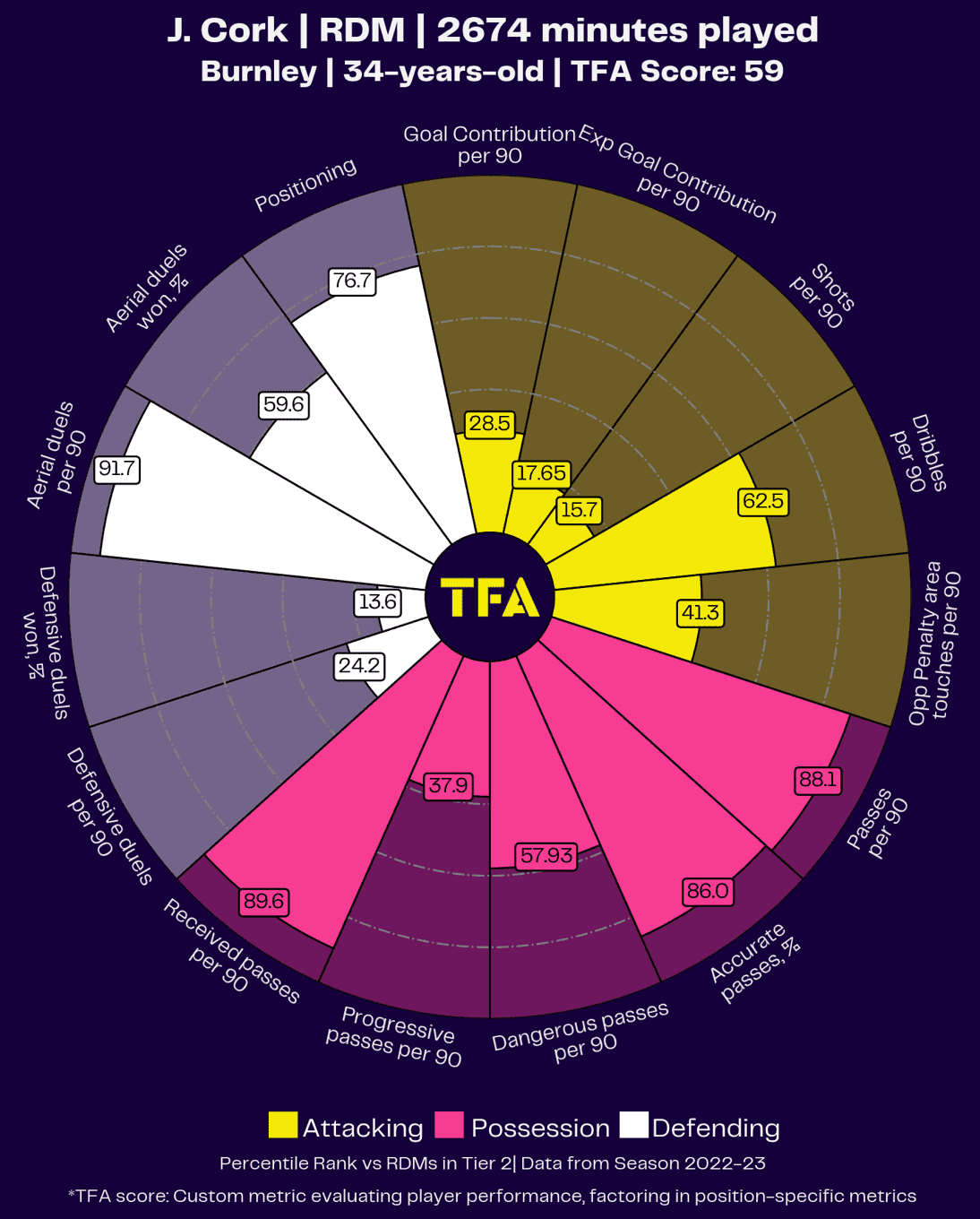 Since Cork was hardly present for Burnley this season, we cannot post his percentile performance, so to gain an understanding of what he brings to the table in the Championship, we have a graph of his 22/23 season percentile performance above.