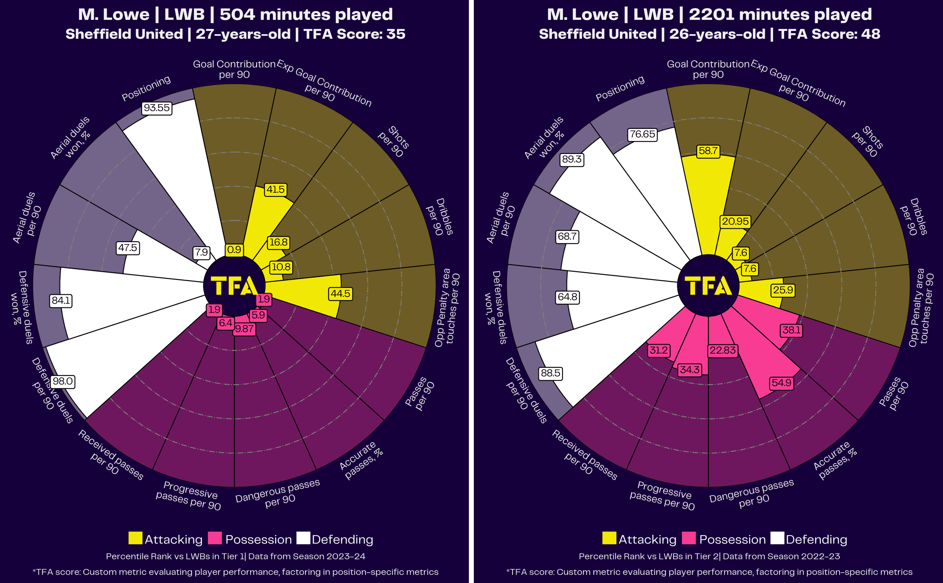 The graph on the left should be taken with a pinch of salt due to Lowe’s limited involvement this season but also because of how dire Sheffield United were throughout the campaign. In some ways, Lowe’s in-possession percentiles reflect the Blades’ struggle to get the ball forward effectively.