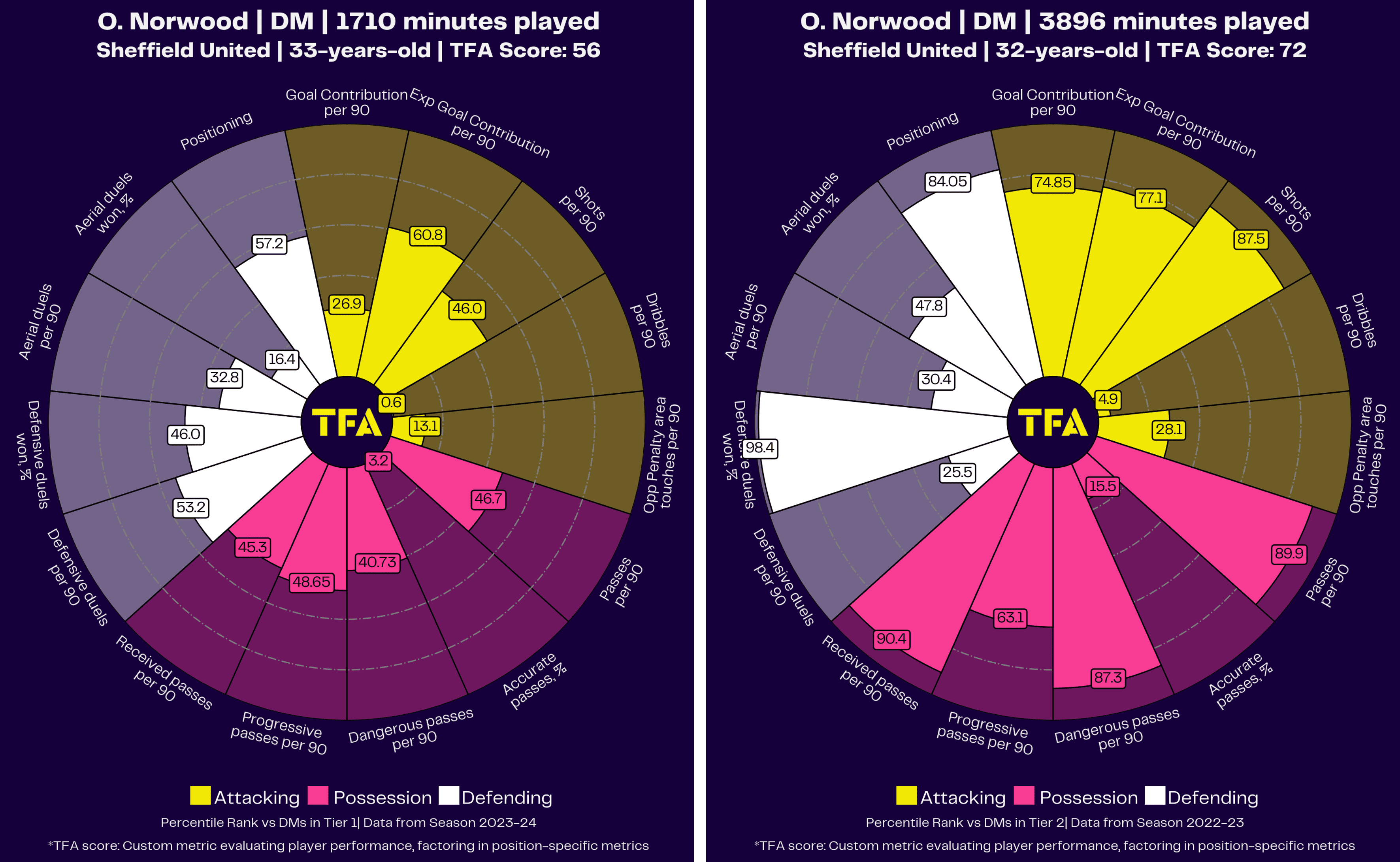 The above graphs represent Osho’s performance over the last two seasons in the form of percentile rankings. Now, a theme with these graphs is going to be common: their data from the 23/24 season will reflect a worse performance than the 22/23 data for the obvious reason that they got promoted in one of those seasons and relegated in the other.