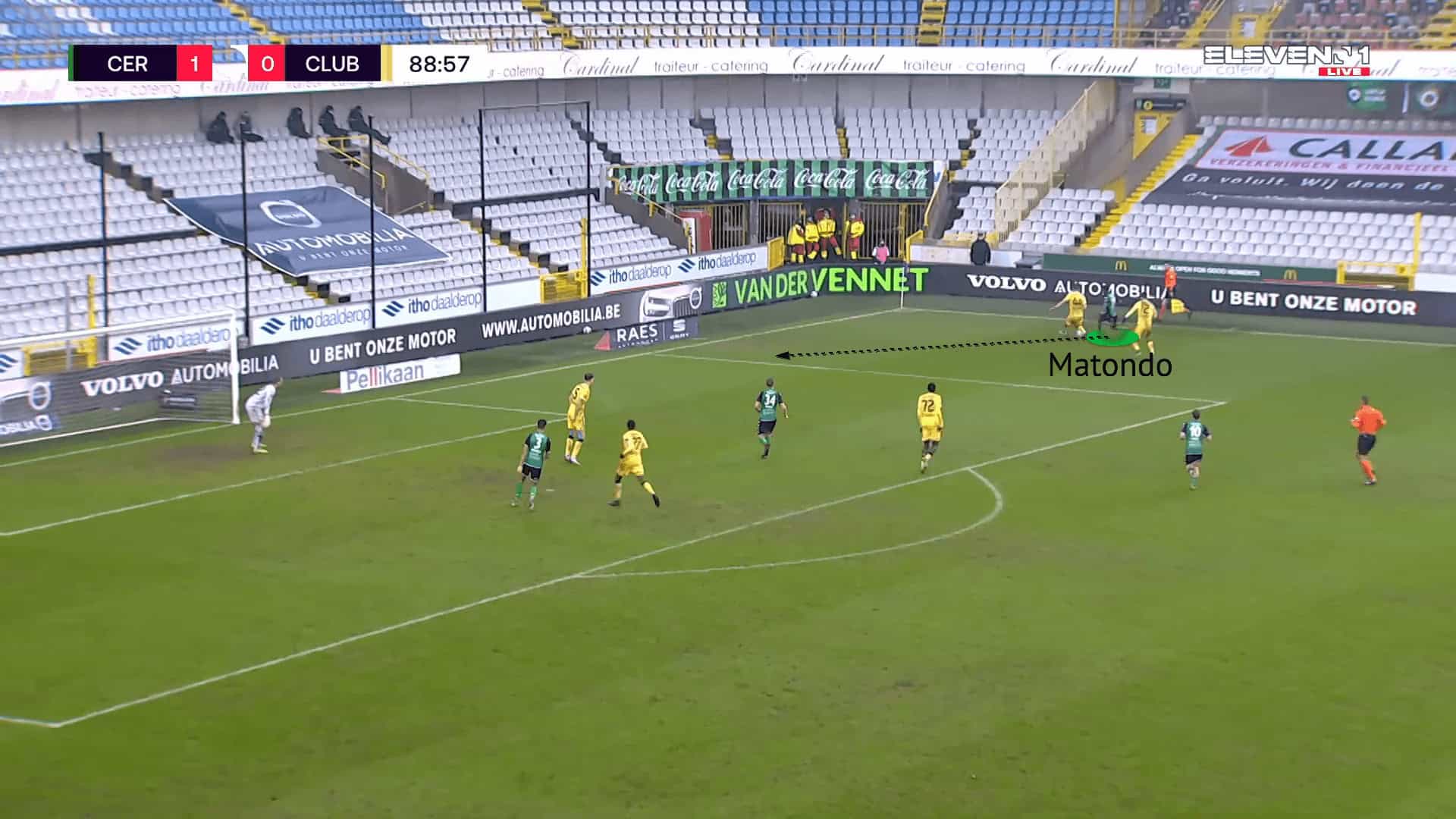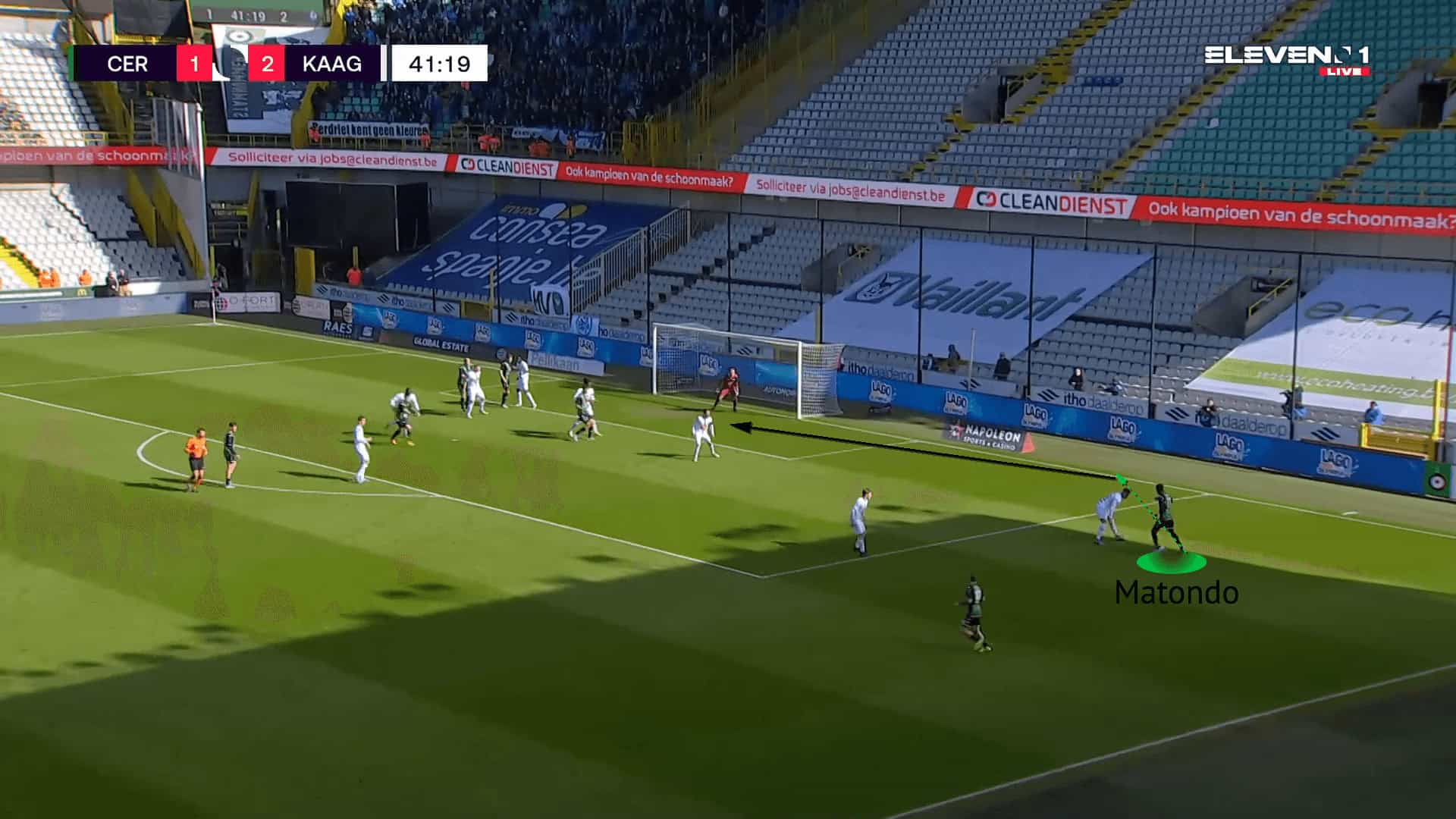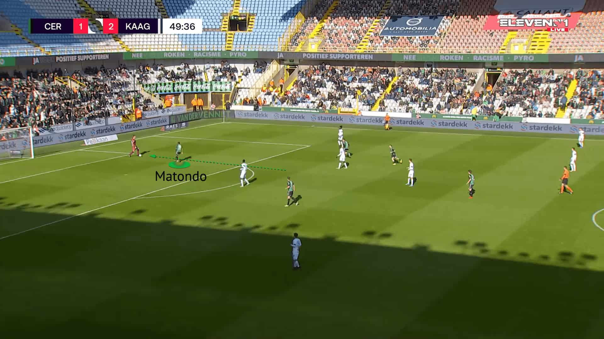 The figure above is an example against Mechelen, where Matondo initially started as a left-winger. Drifting wide to the right, he has drawn out and isolated the opponent. He then used his pace to drive past the defender with his dribbling to break into the box.