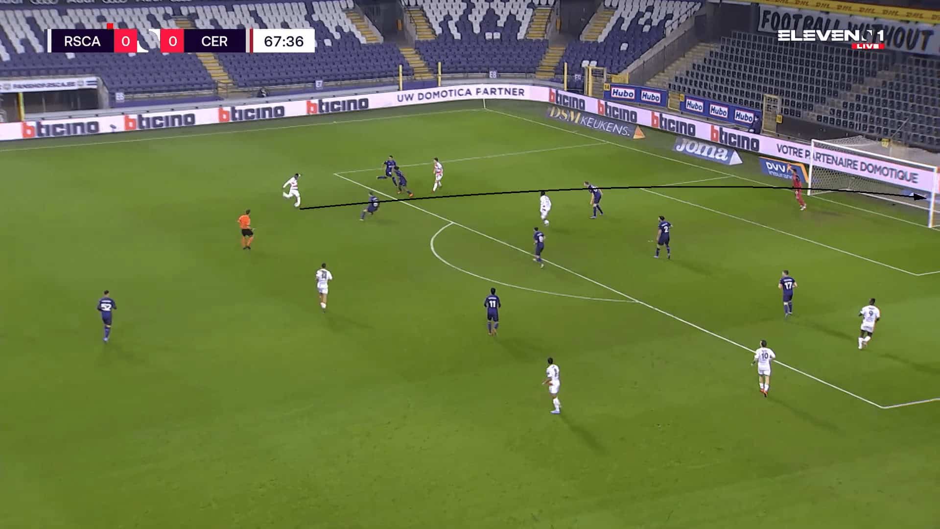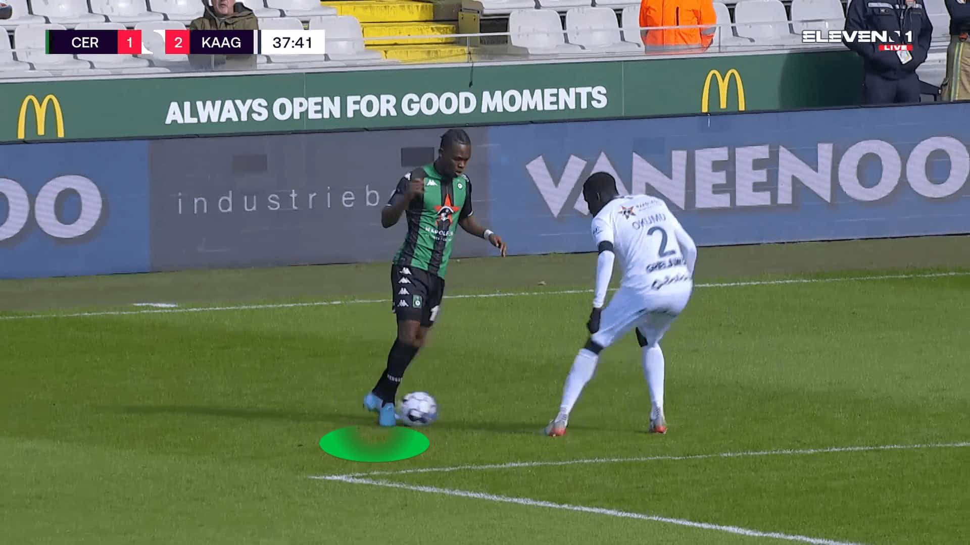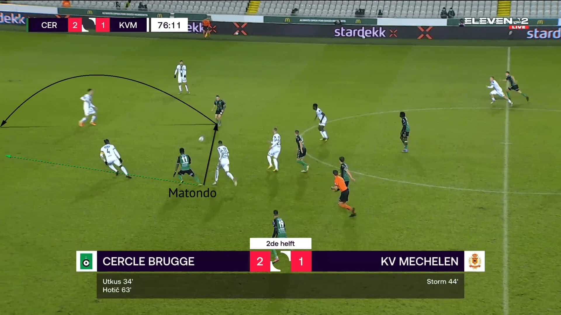 The figure above is an example against Mechelen, where Matondo initially started as a left-winger. Drifting wide to the right, he has drawn out and isolated the opponent. He then used his pace to drive past the defender with his dribbling to break into the box.