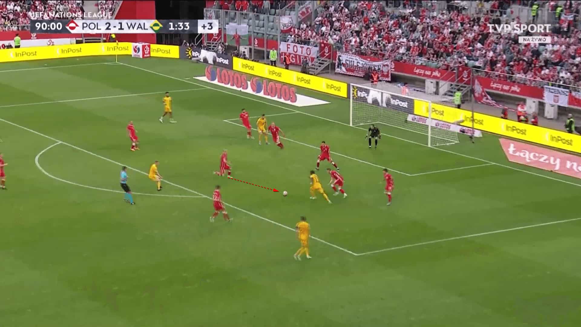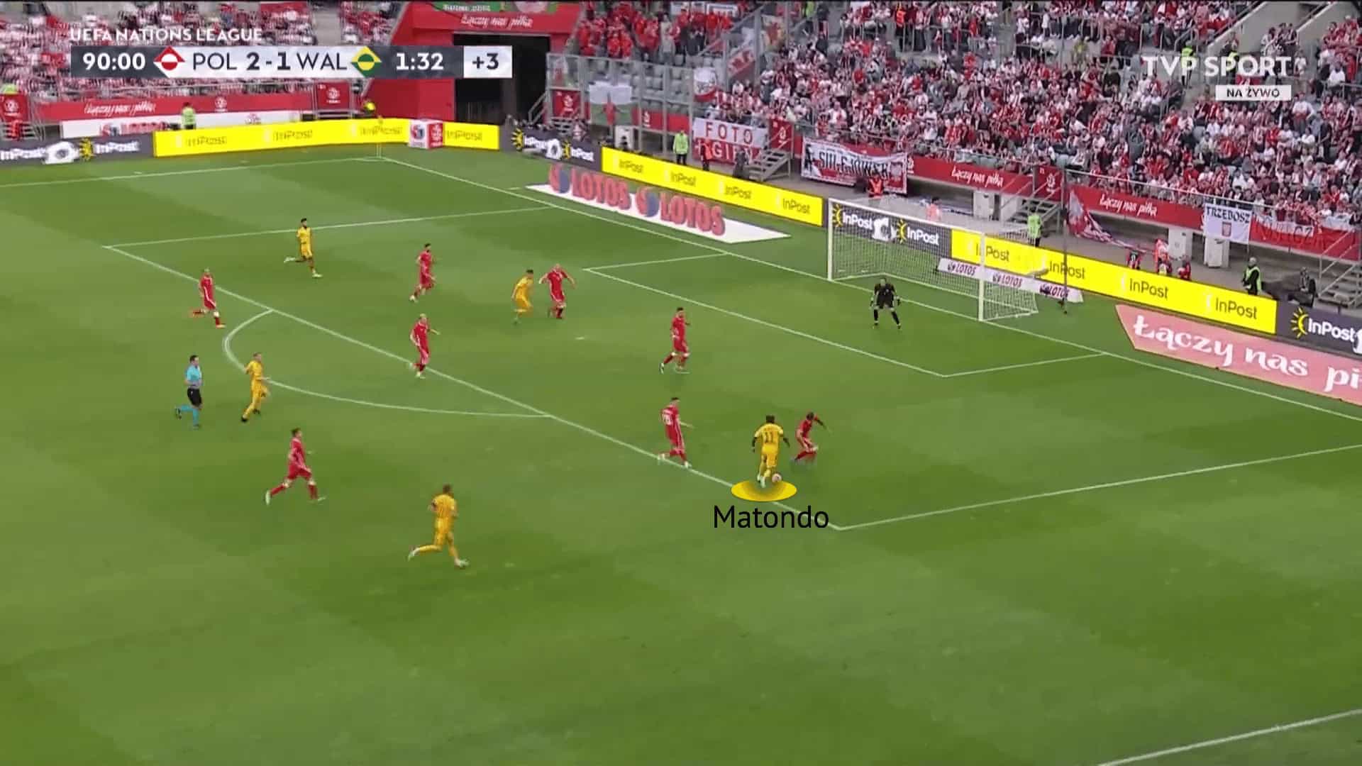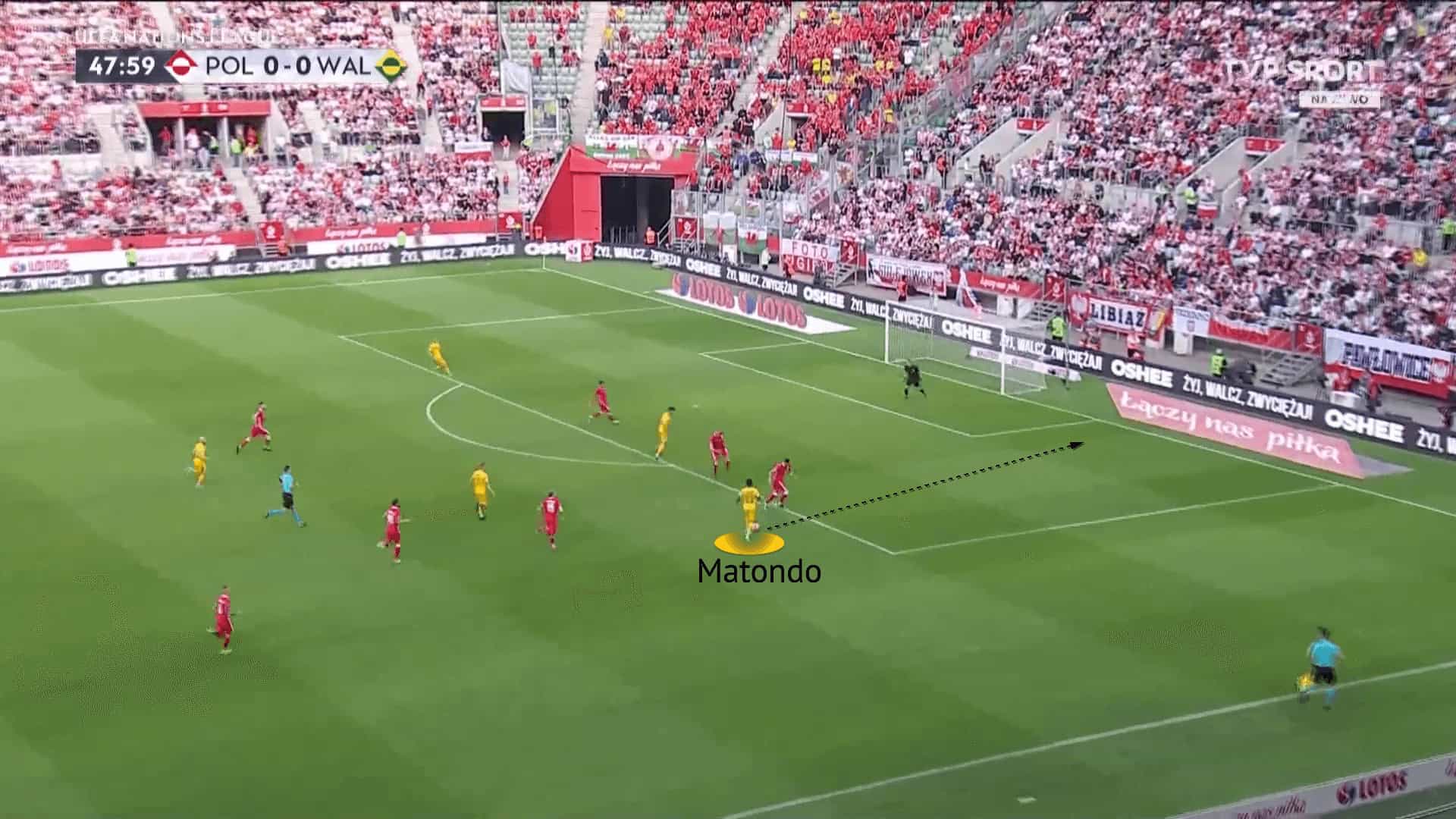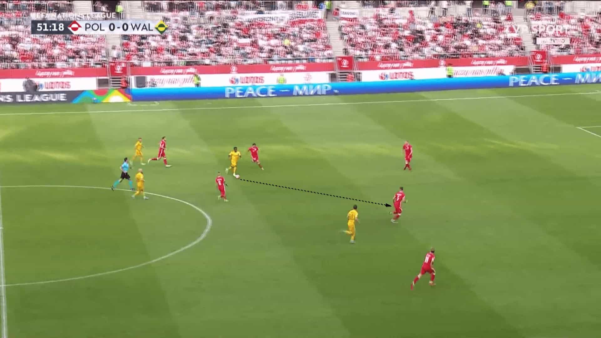 The images above and below follow on from Matondo’s deeper play, but off the wing rather than centrally. The Wales international has drifted into space on the right wing to receive a pass away from pressure. With a poor first touch under his body, he utilised his acceleration to build up speed and charge at the now retreating Poland defence.