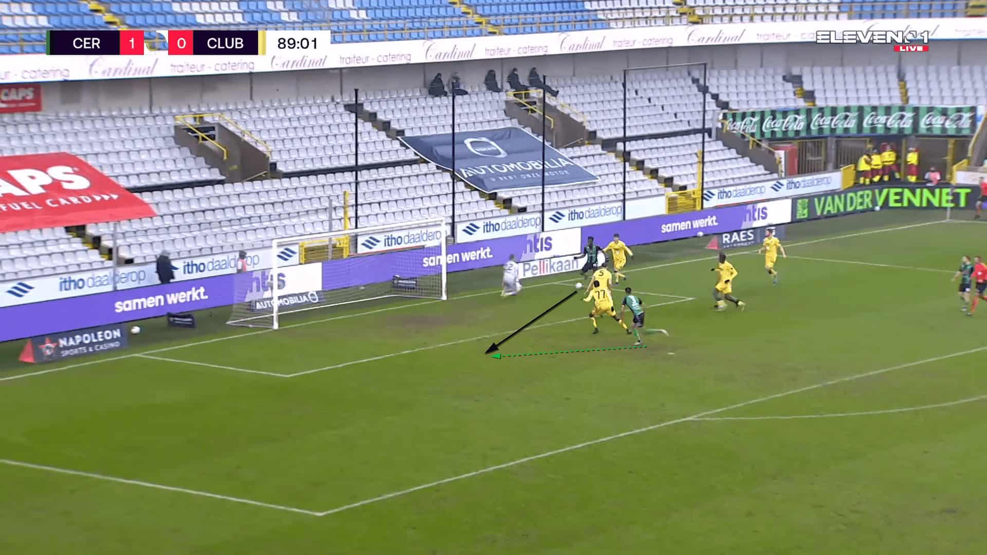 At Cercle Brugge, the Wales international would offer a short corner option, particularly on the right. The image above is an example of Matondo receiving a short corner and using his burst of pace and dribbling on the right to beat his man and deliver a hard and low cross. His ability to beat his man can be used in the 1vs1 situations and has also forced the opposition to take an extra player out of the box in an attempt to nullify and prevent Matondo from receiving and beating his man.
