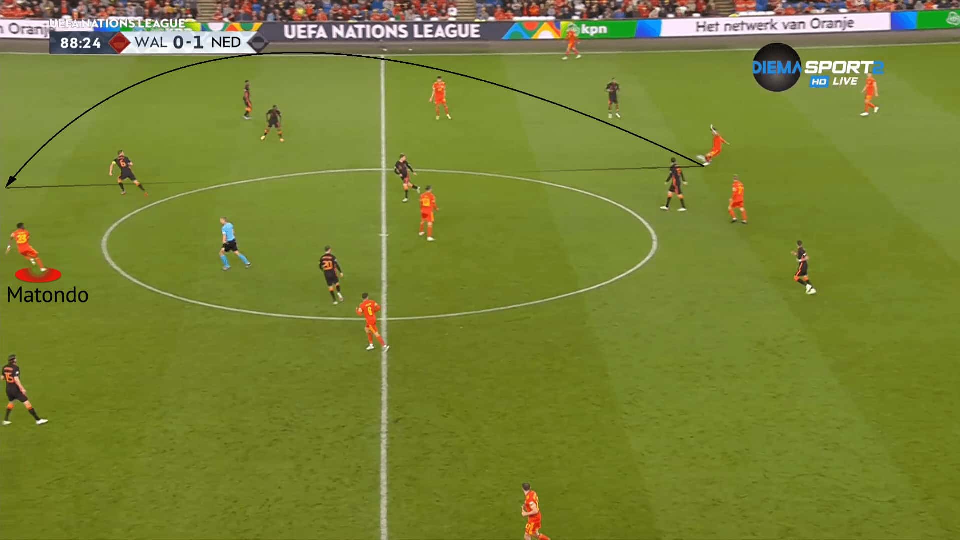 When in the box, Matondo made a rash decision to drill the ball across the face of the goal rather than finding striker Kévin Denkey in the six-yard box. In the image below, Matondo has penetrated the Netherlands’ defensive line. Jordan Teze is the deepest of the back three, playing Matondo onside, but is out of the picture. Stefan de Vrij and Bruno Martins Indi, the two remaining centre-backs, are leaving Matondo and Teze one-on-one for the lofted pass in behind from Tottenham’s Joe Rodon.
