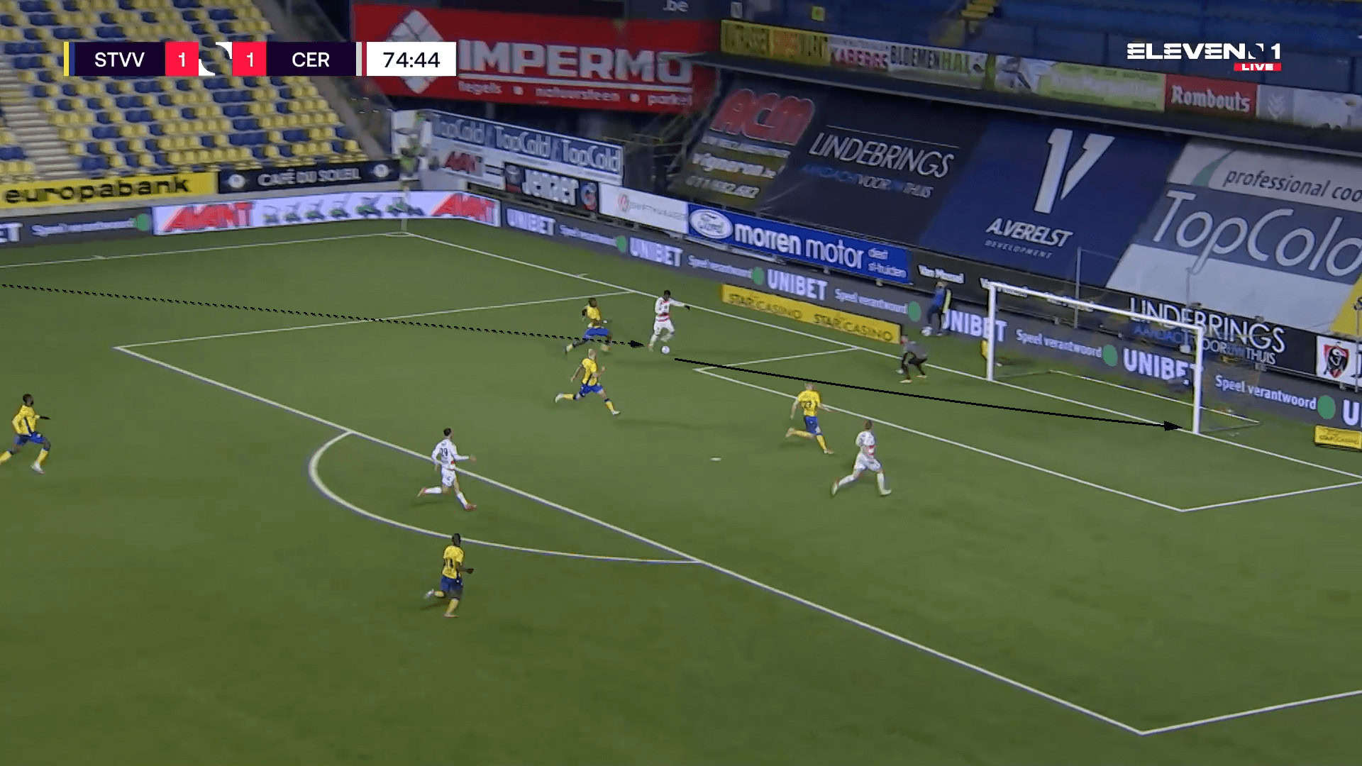 The two figures above and below show an example of his threat in transitions, whilst also displaying his aforementioned endurance to sustain his intensity in the latter stages of matches. As Vitinho breaks forward in possession, Matondo provides support from behind with an overlapping run to exploit the wide space in the defence. After Vitinho’s carry, he releases Matondo just inside the box who continues wide and plays the ball squarely with his left foot for attacker Thibo Somers to convert after getting across his man in the six-yard-box.