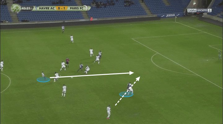 Being 1-0 up, the Paris FC defence is happy to have all but 1 man behind the ball, their formation leaving little room for advanced midfielders to operate in. Guitane chooses to drop deep to find space, his markers do not follow him as they know how quick he can turn and dribble.