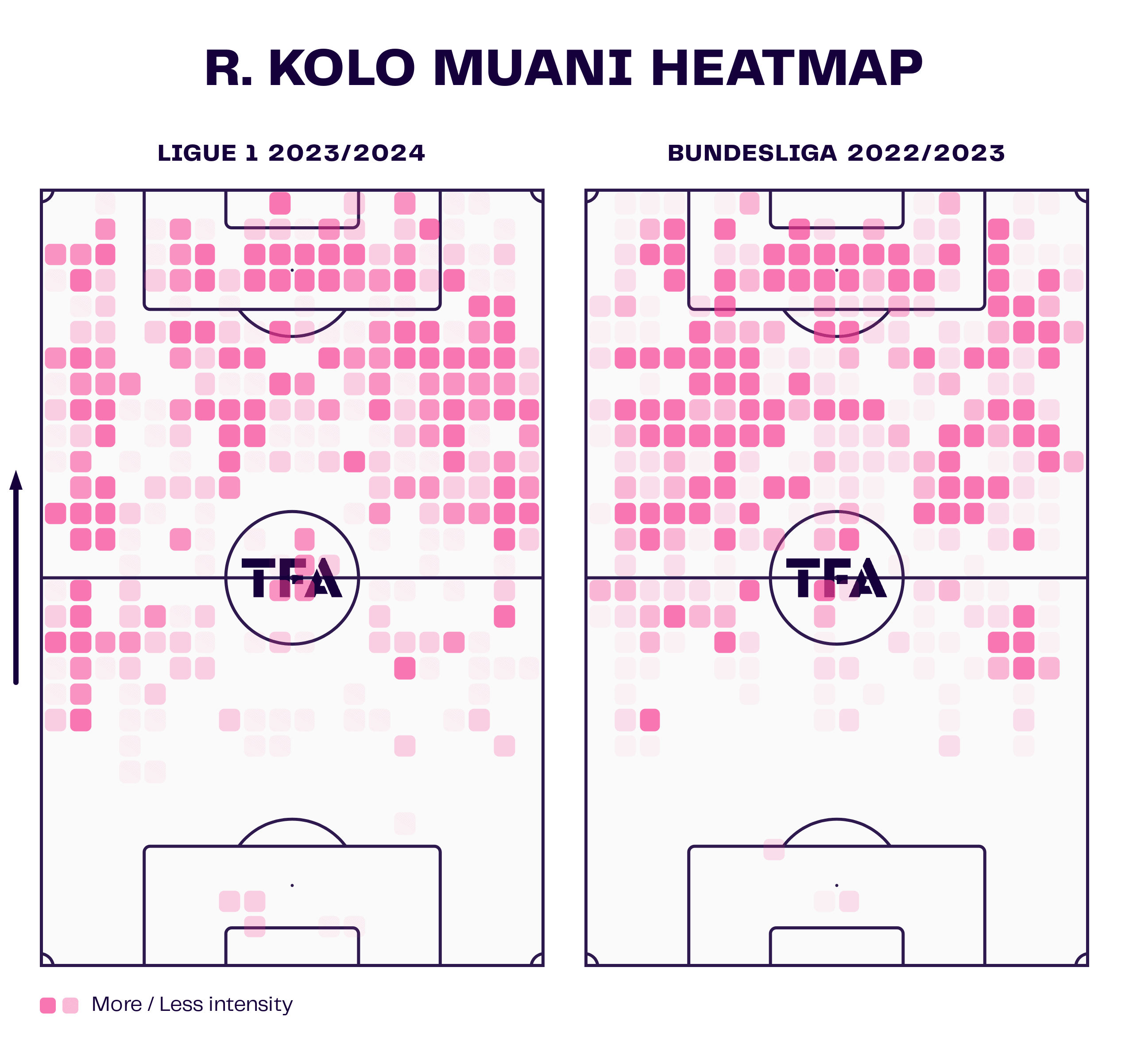 The heat maps above show that Kolo Muani does not tend to remain in one particular position; rather, he regularly gets involved centrally and on the wings.