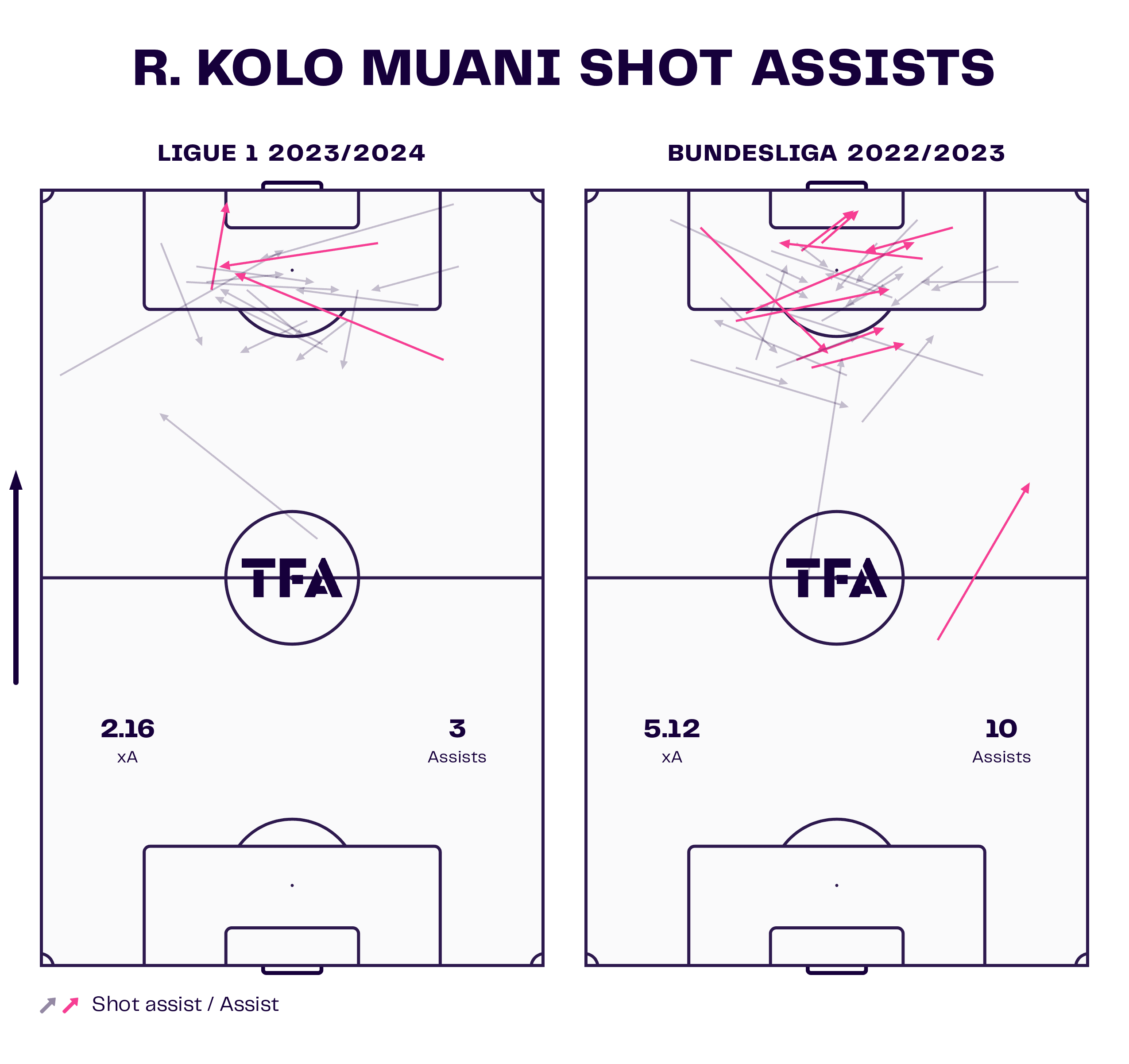 In 2022/23, Kolo Muani was put in a position to assist from the centre more often, and he took advantage of that opportunity to boost his assist numbers dramatically.
