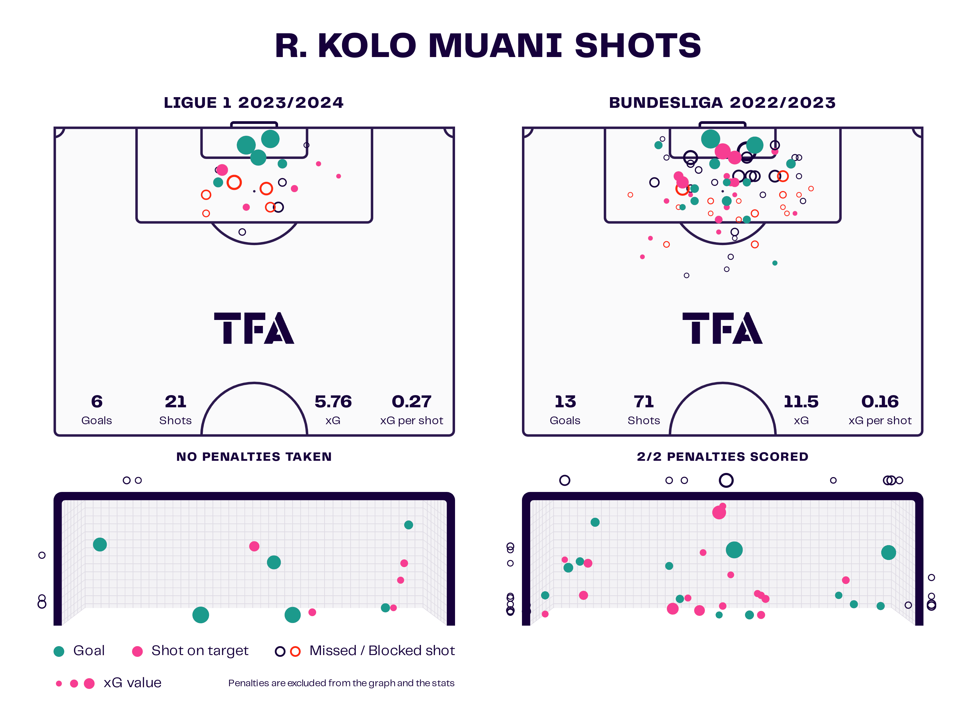 Under Luis Enrique, Kolo Muani’s shooting was essentially limited to strictly high-percentage shot locations in 2023/24.