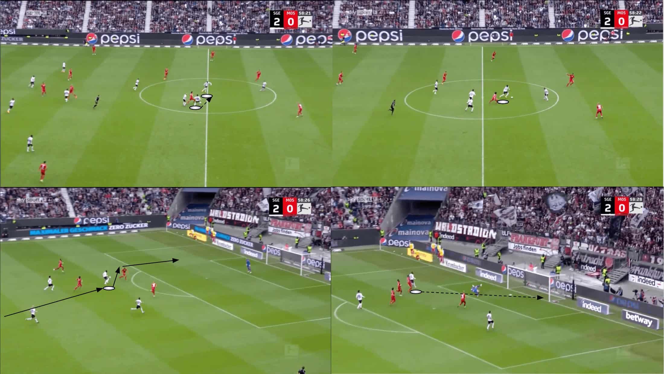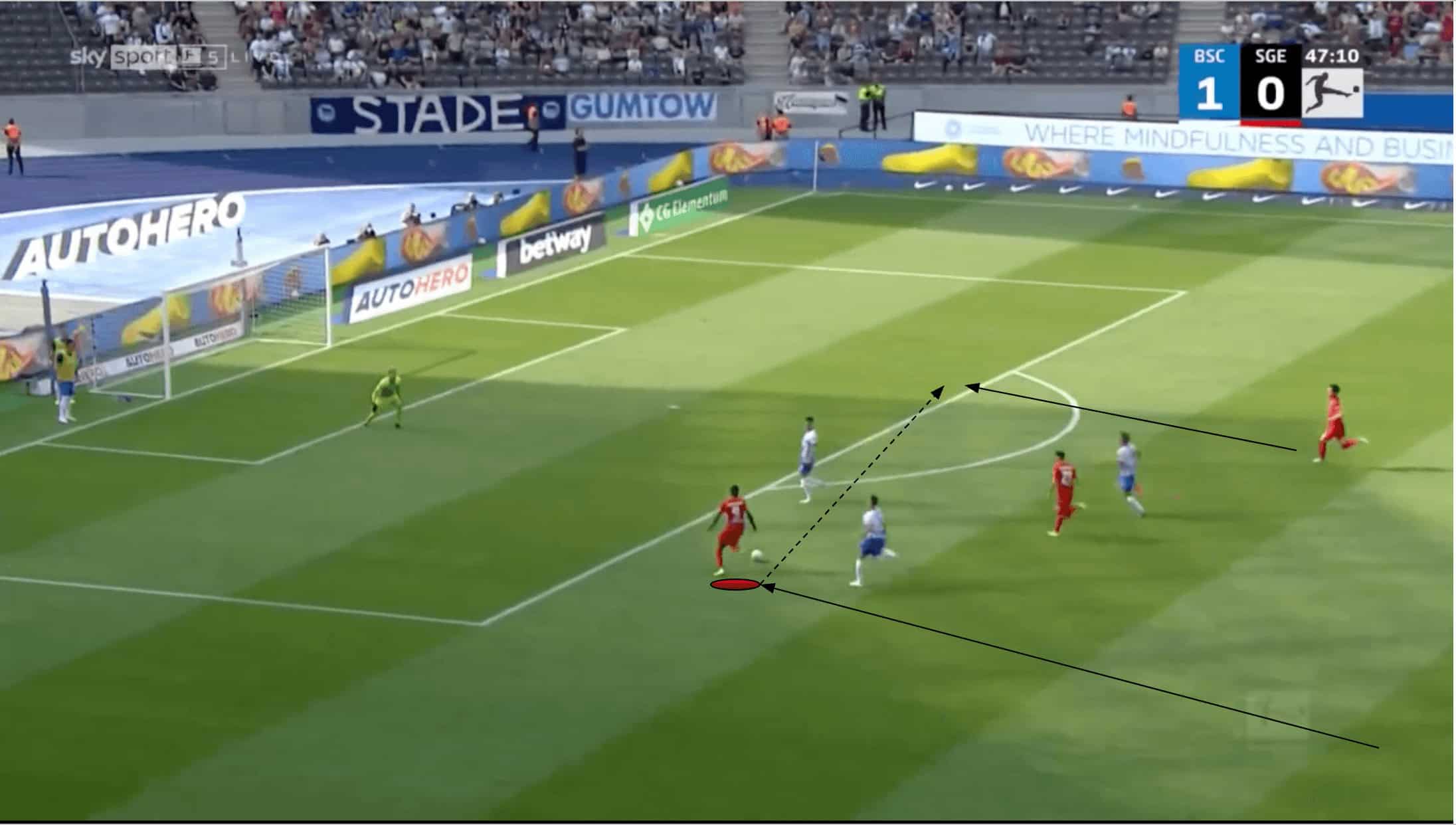 In this case, Kolo Muani got on the ball in the middle of the pitch before carrying forward towards a weakened opposition backline in transition.