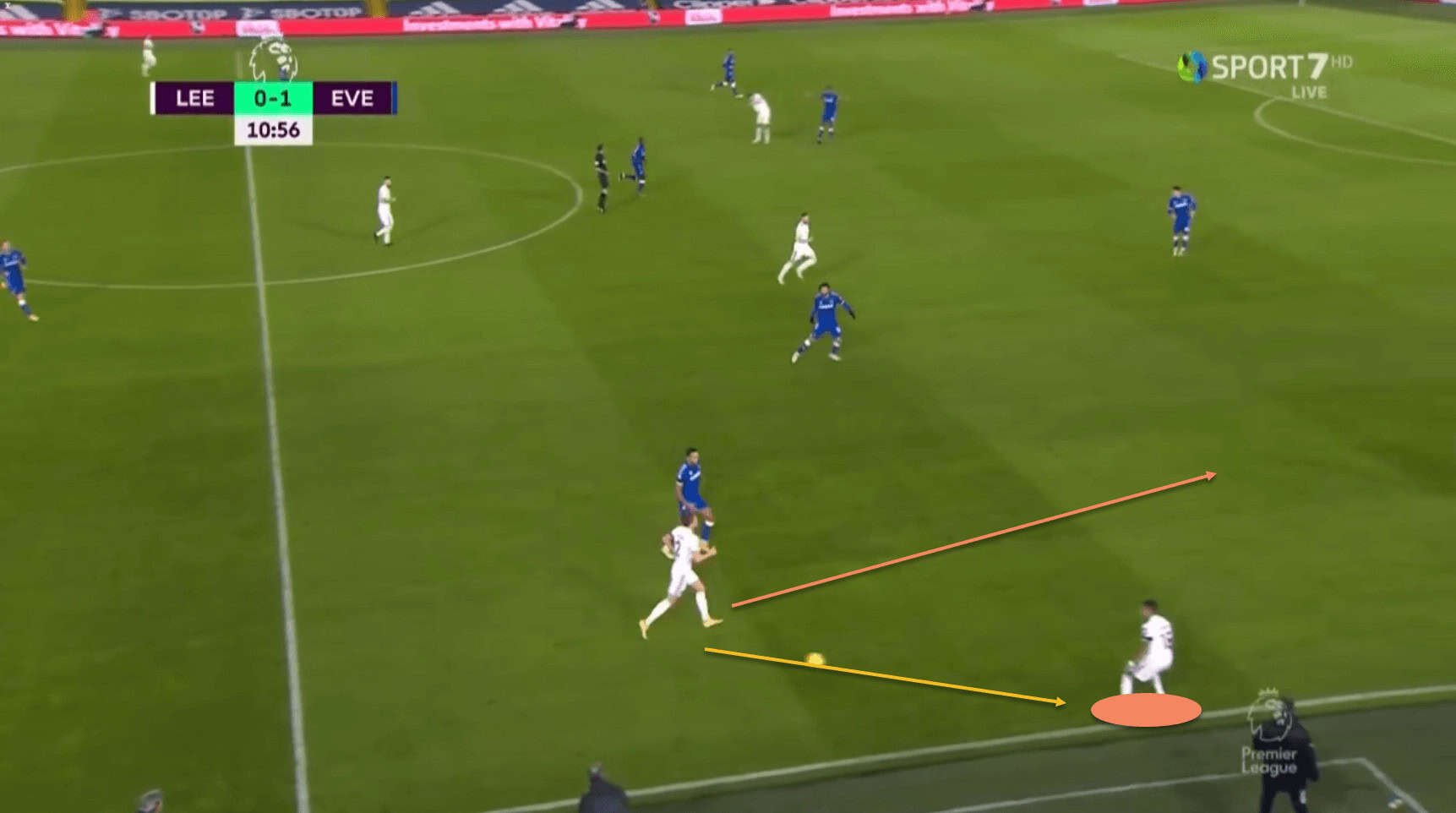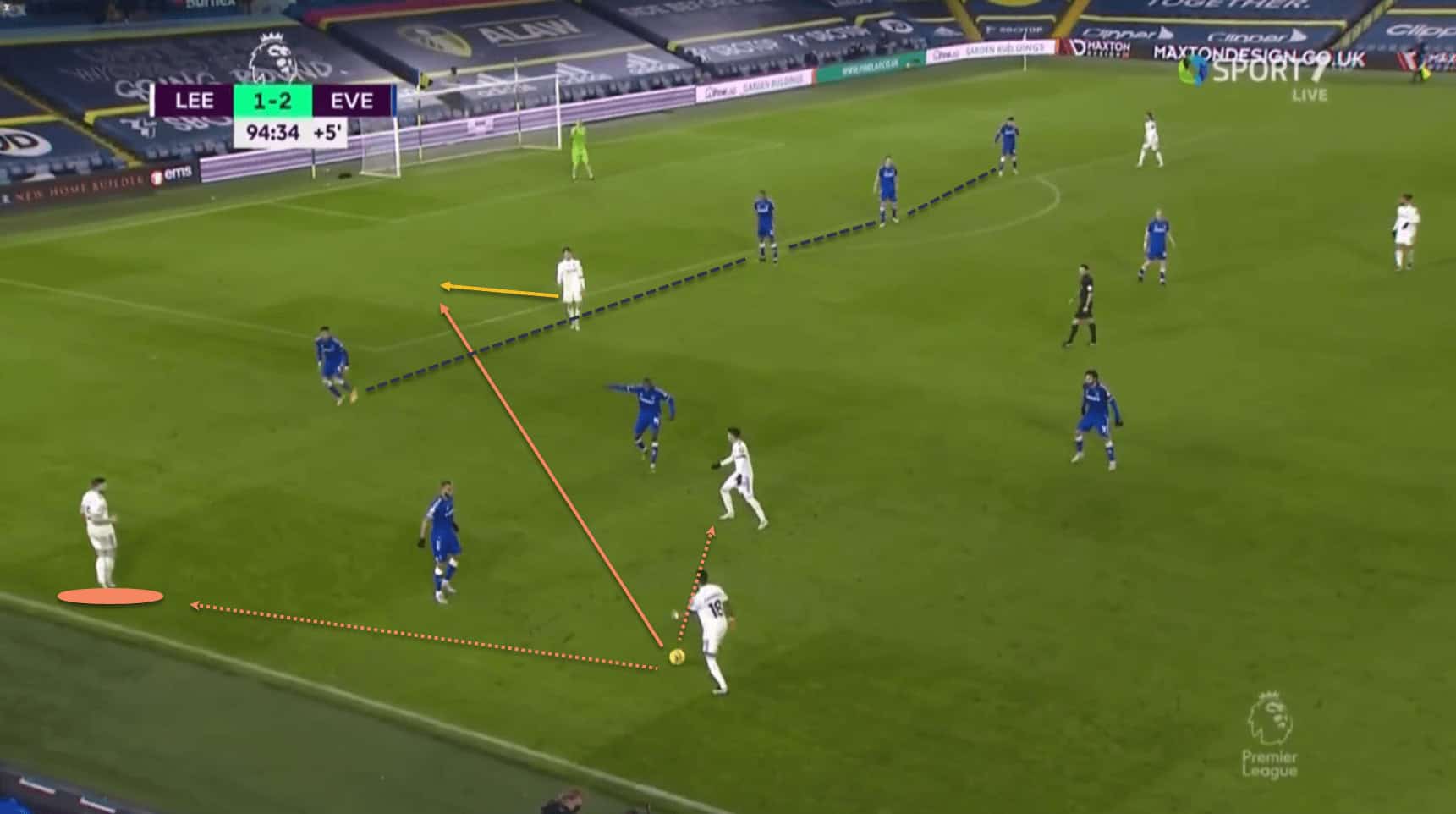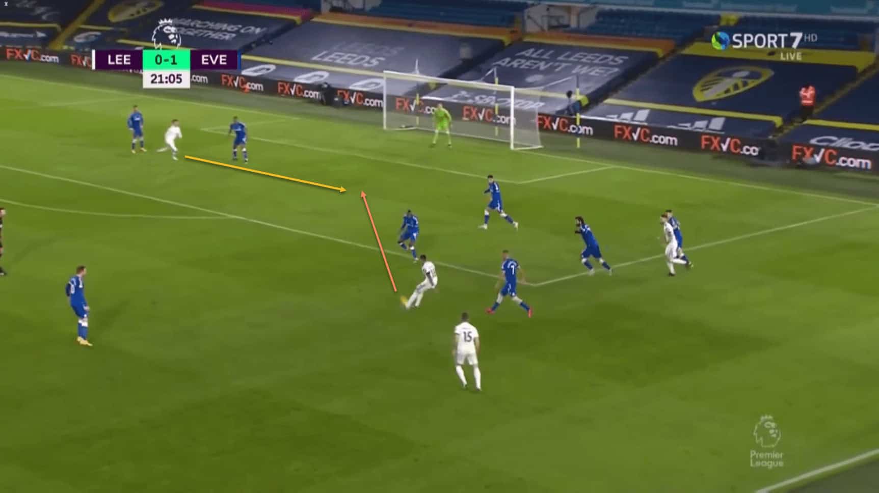 This means that he is in a lot of space to receive the ball from Bamford, with the Everton players having been drawn towards Ayling, and Digne keeping tabs on Klich.