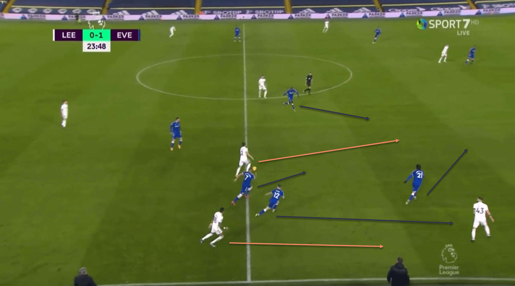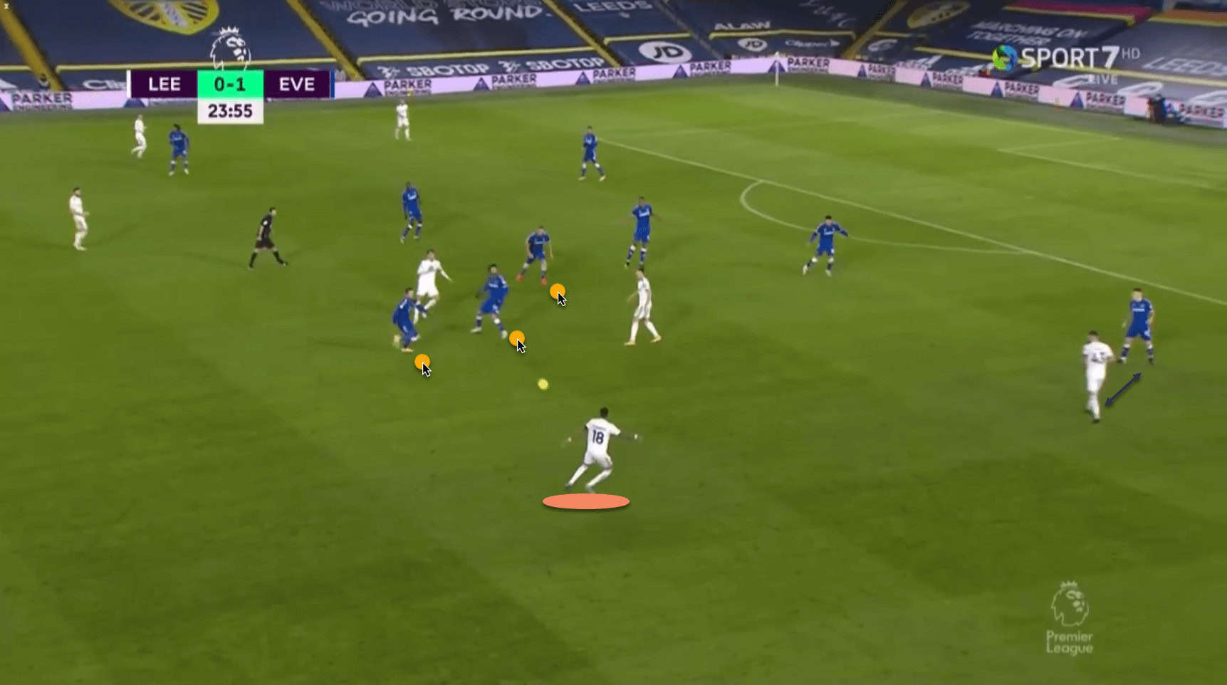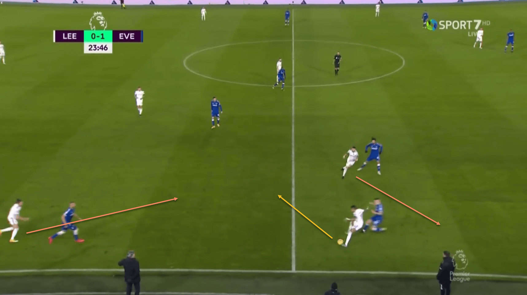 This means that he is in a lot of space to receive the ball from Bamford, with the Everton players having been drawn towards Ayling, and Digne keeping tabs on Klich.