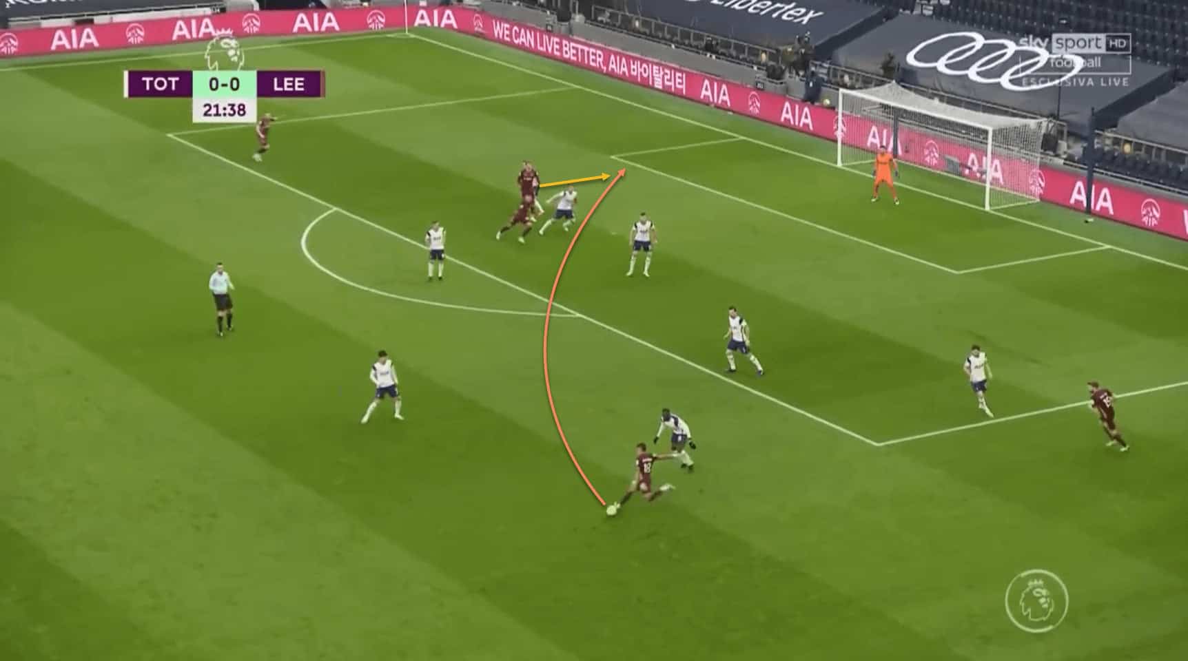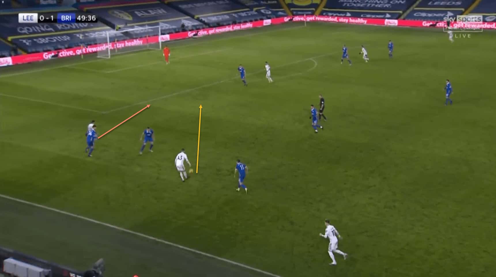 Here, the winger is able to find space in the right half-space to deliver a brilliant cross for Patrick Bamford, who is unable to get his header on target.